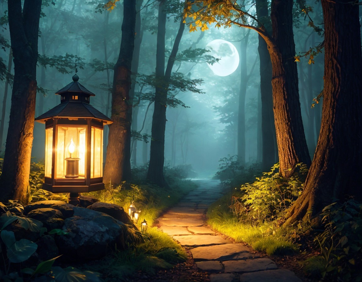 A lantern illuminates a stone path in a misty, moonlit forest, evoking a serene, mystical atmosphere.
