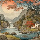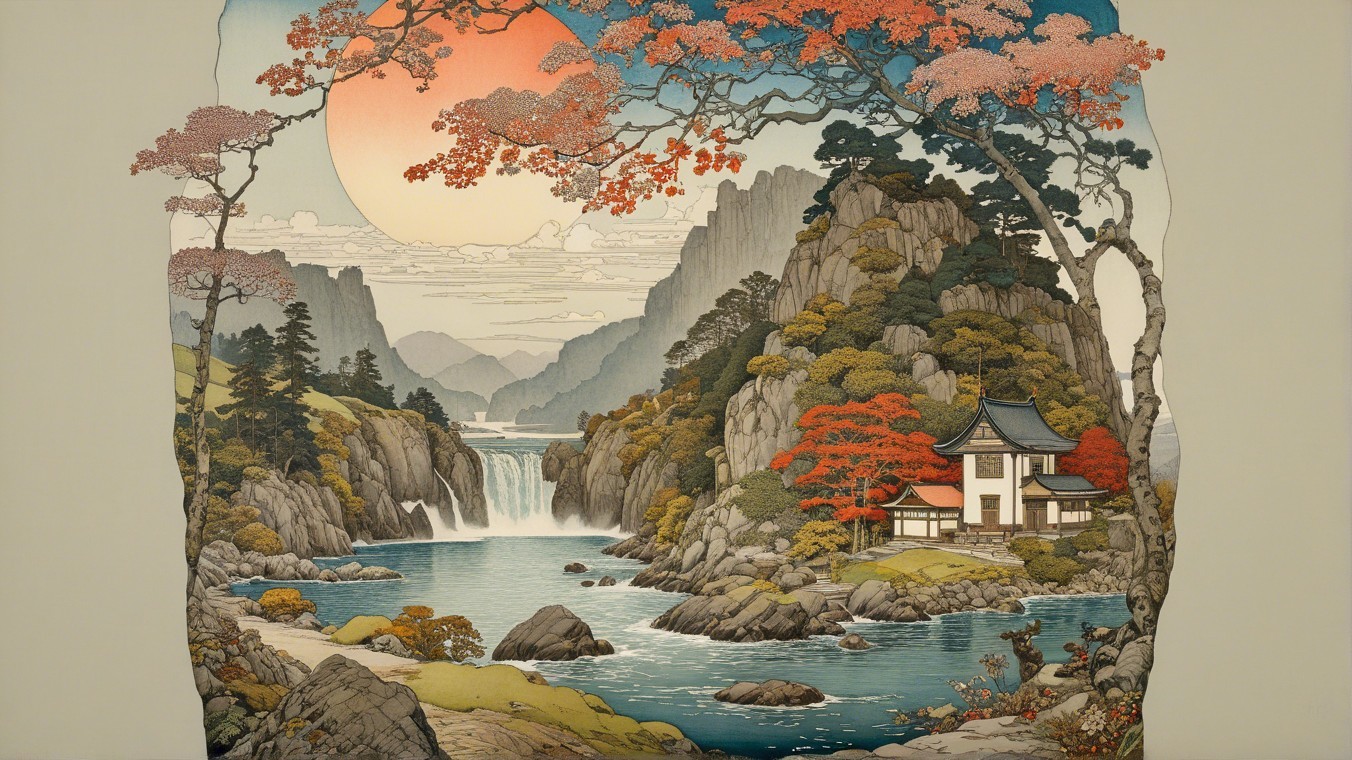 A serene landscape featuring traditional Japanese architecture along a tranquil river, surrounded by mountains and trees, illuminated by a vivid sunset. A boat drifts peacefully on the water.