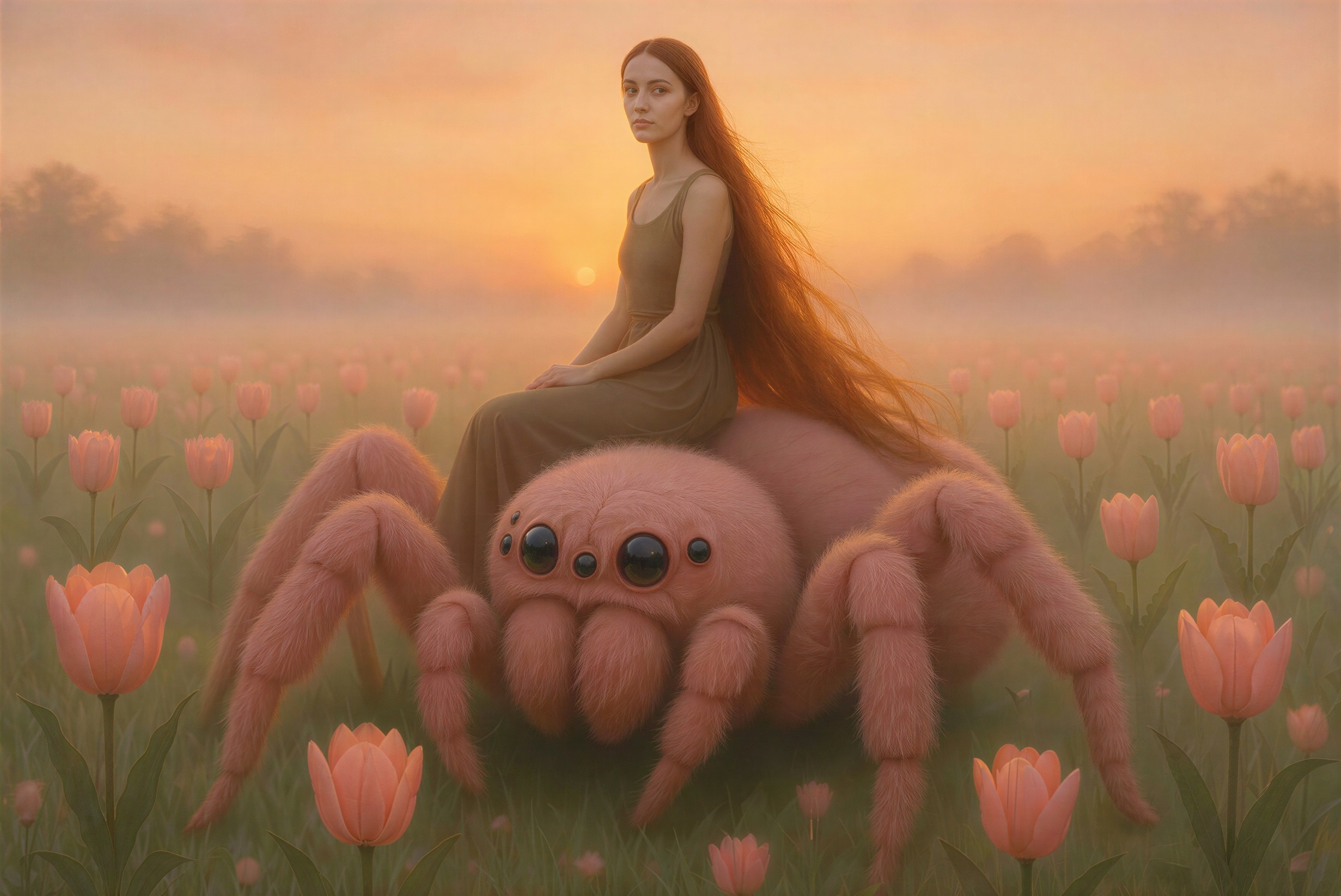 A woman with red-brown hair sits on the back of a large, fuzzy, pink spider in a field of peach-colored tulips during a foggy sunrise.