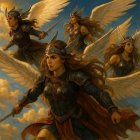 A group of majestic angelic figures with large wings and ornate armor soar through a bright sky, holding swords and exuding a sense of power and protection amidst fluffy clouds.