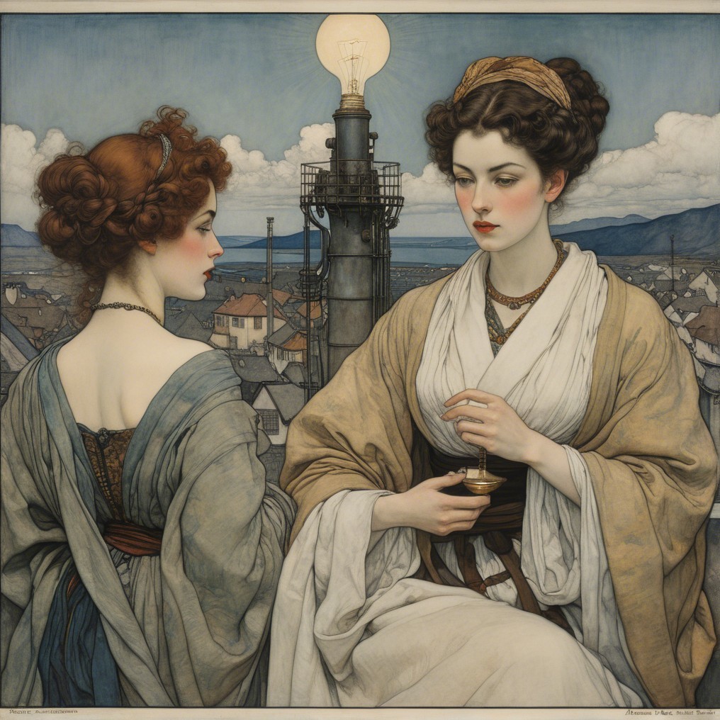 The image depicts two elegant women with flowing hair, dressed in delicate, period-inspired attire. One gazes thoughtfully to the side, while the other looks straight ahead, set against a scenic town backdrop.