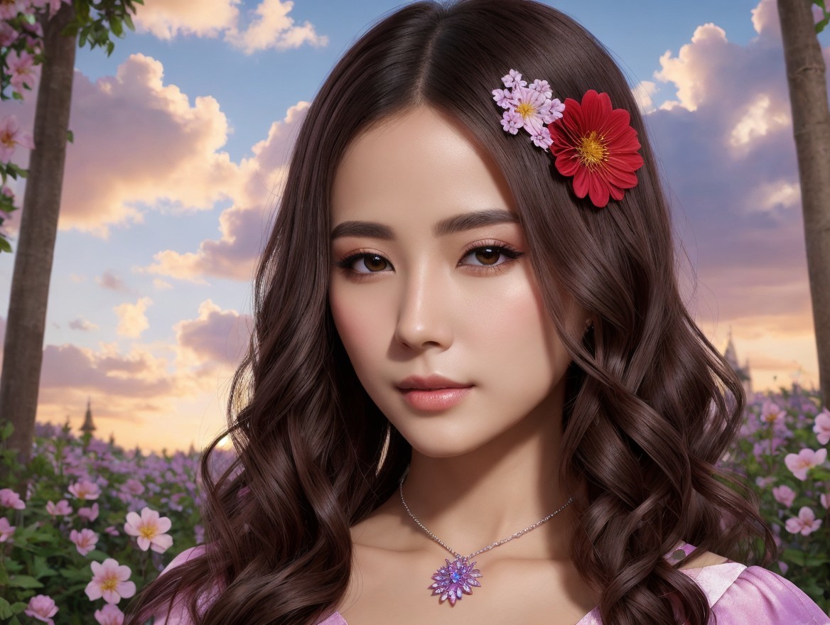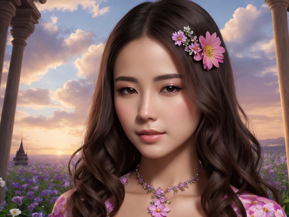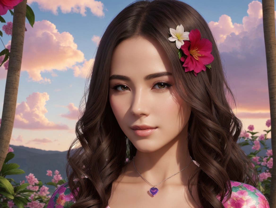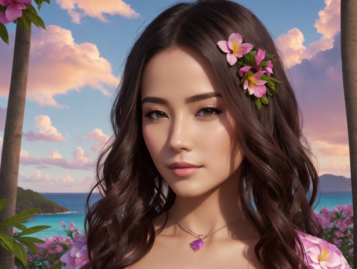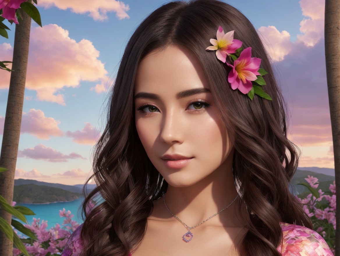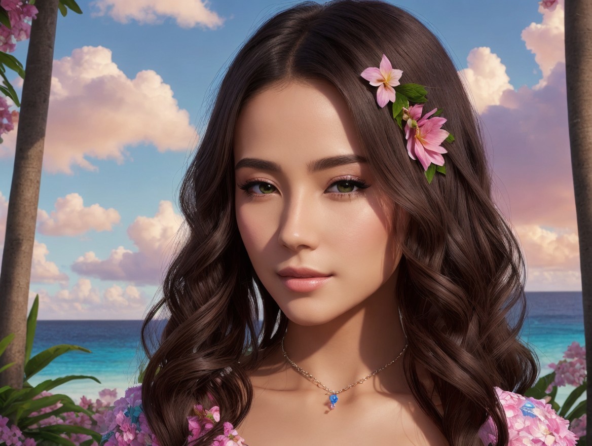 A young woman with long, wavy hair adorned with pink flowers gazes softly at the viewer, set against a vibrant tropical beach and bright blue skies filled with fluffy clouds.