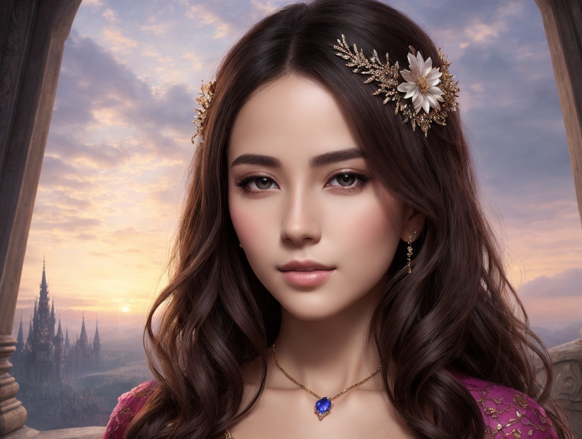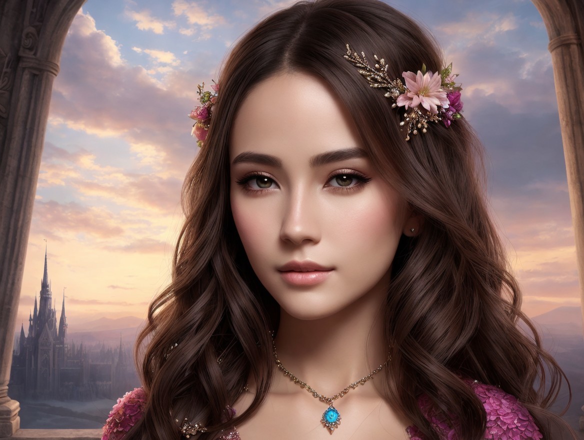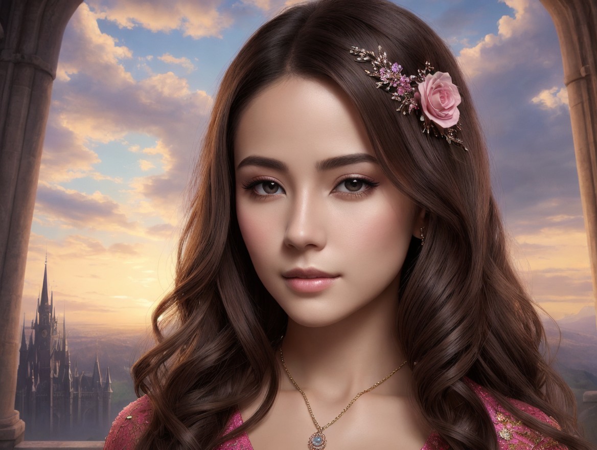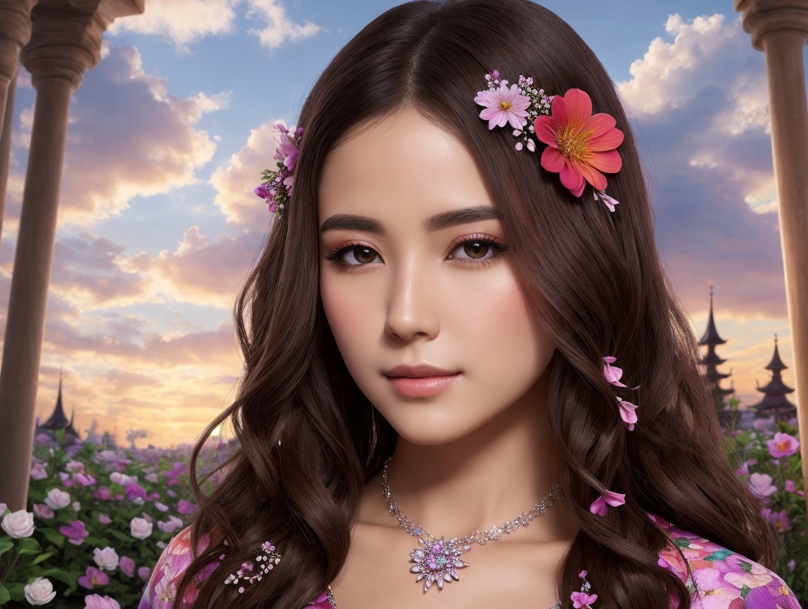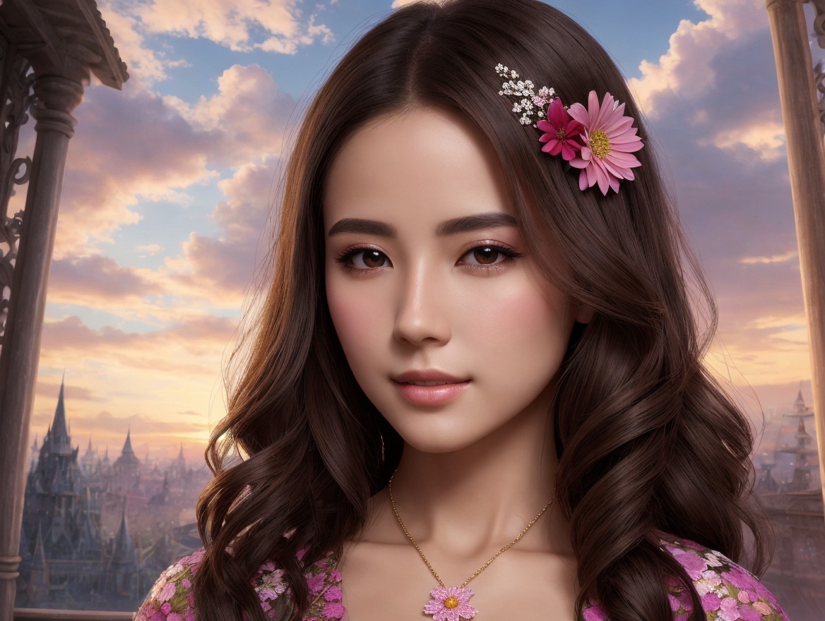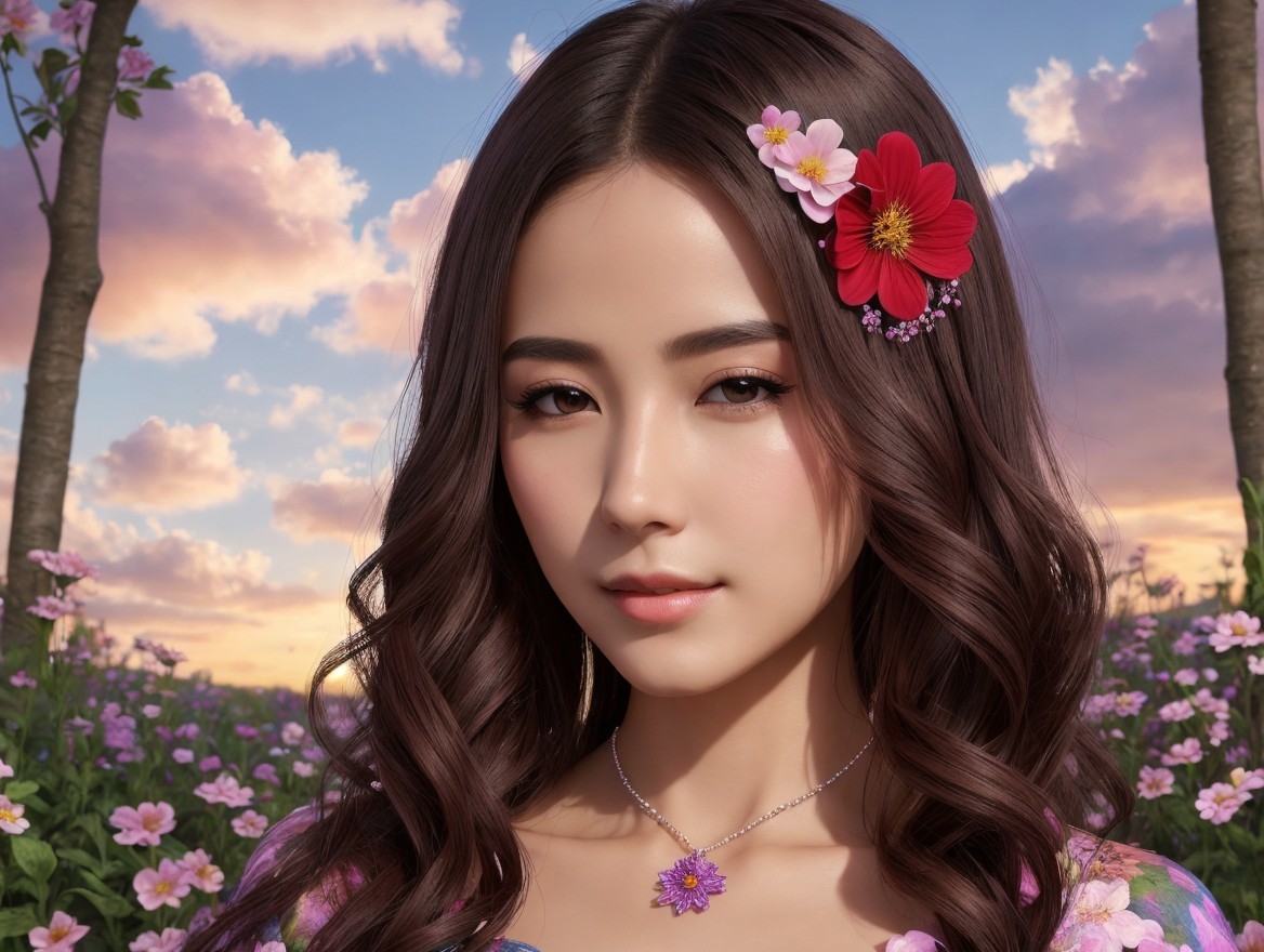 A young woman with long, wavy hair adorned with pink flowers gazes softly at the viewer, set against a vibrant tropical beach and bright blue skies filled with fluffy clouds.