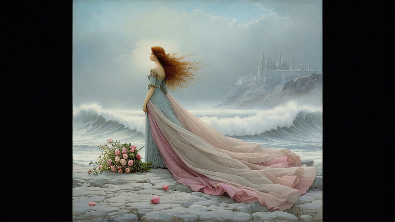 A serene woman in a flowing blue gown stands against a radiant moonlit backdrop, holding flowers. Surrounding her are ornate buildings and blooming lotus flowers, evoking tranquility and beauty.
