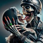 A striking scene features a futuristic woman with bold makeup and accessories, engaging intimately with a mechanical skull adorned with steampunk elements, creating a blend of beauty and machinery.