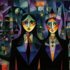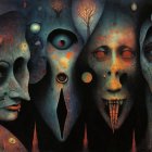 The artwork features abstract, surreal faces with expressive features, blending dark tones and vivid colors. Mysterious elements like planets and ethereal symbols enhance its eerie, dreamlike quality.