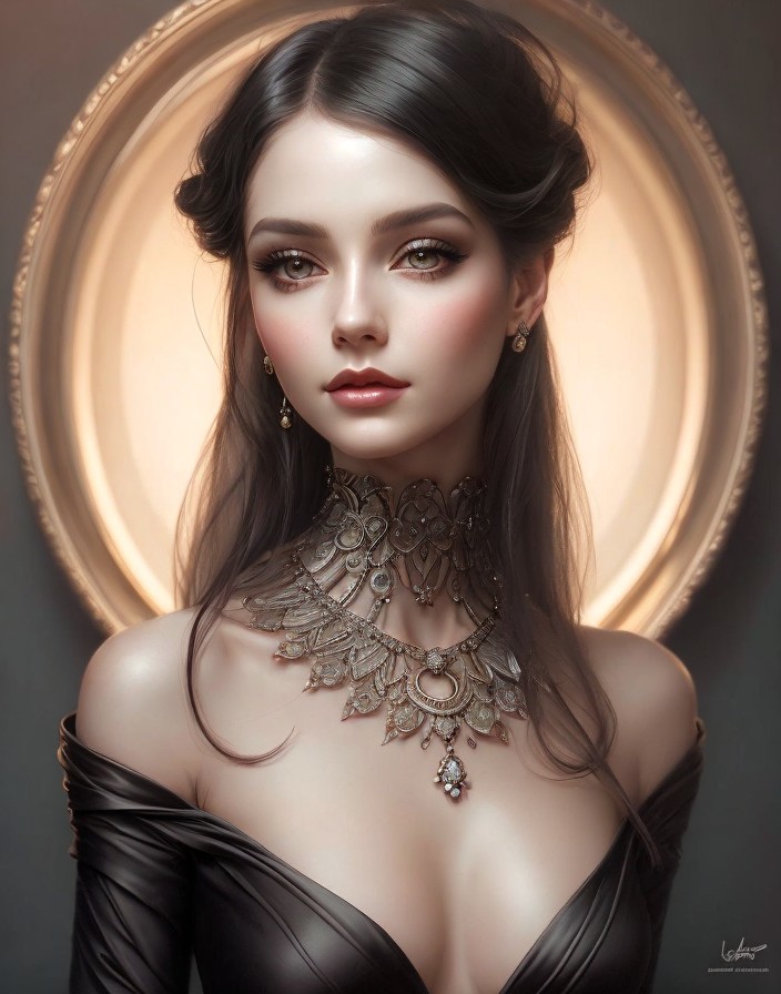 A portrait of a woman with striking eyes, wearing a black off-shoulder dress and an elaborate necklace, with a round frame behind her.