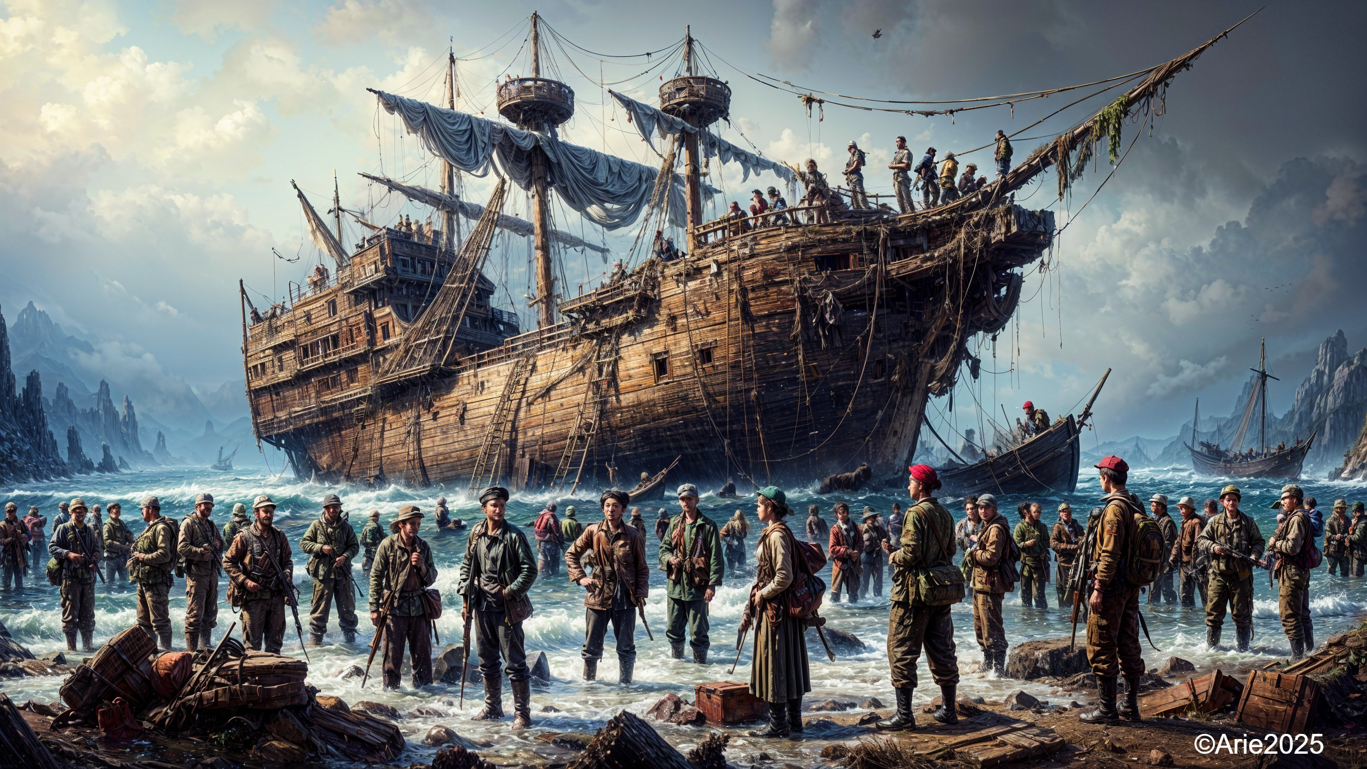 A fantastical scene depicts a derelict pirate ship grounded, surrounded by surprised military personnel. The artwork, reminiscent of oil paintings, showcases intricate details and vibrant colors.
