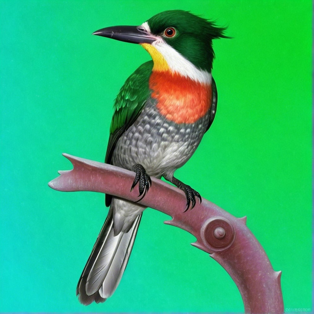 A colorful bird perches on a thorny branch, showcasing vibrant feathers in shades of green, orange, and gray, with a striking black crown and a long tail against a bright green background.