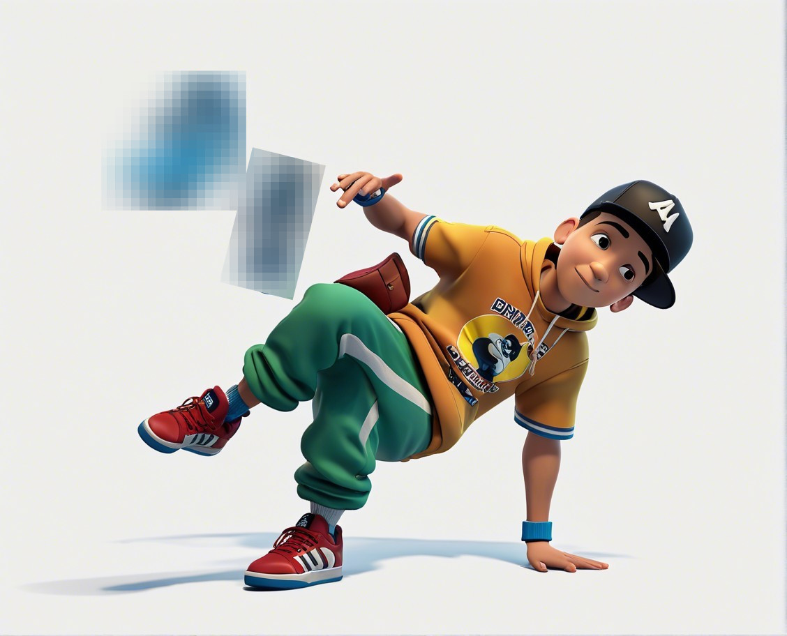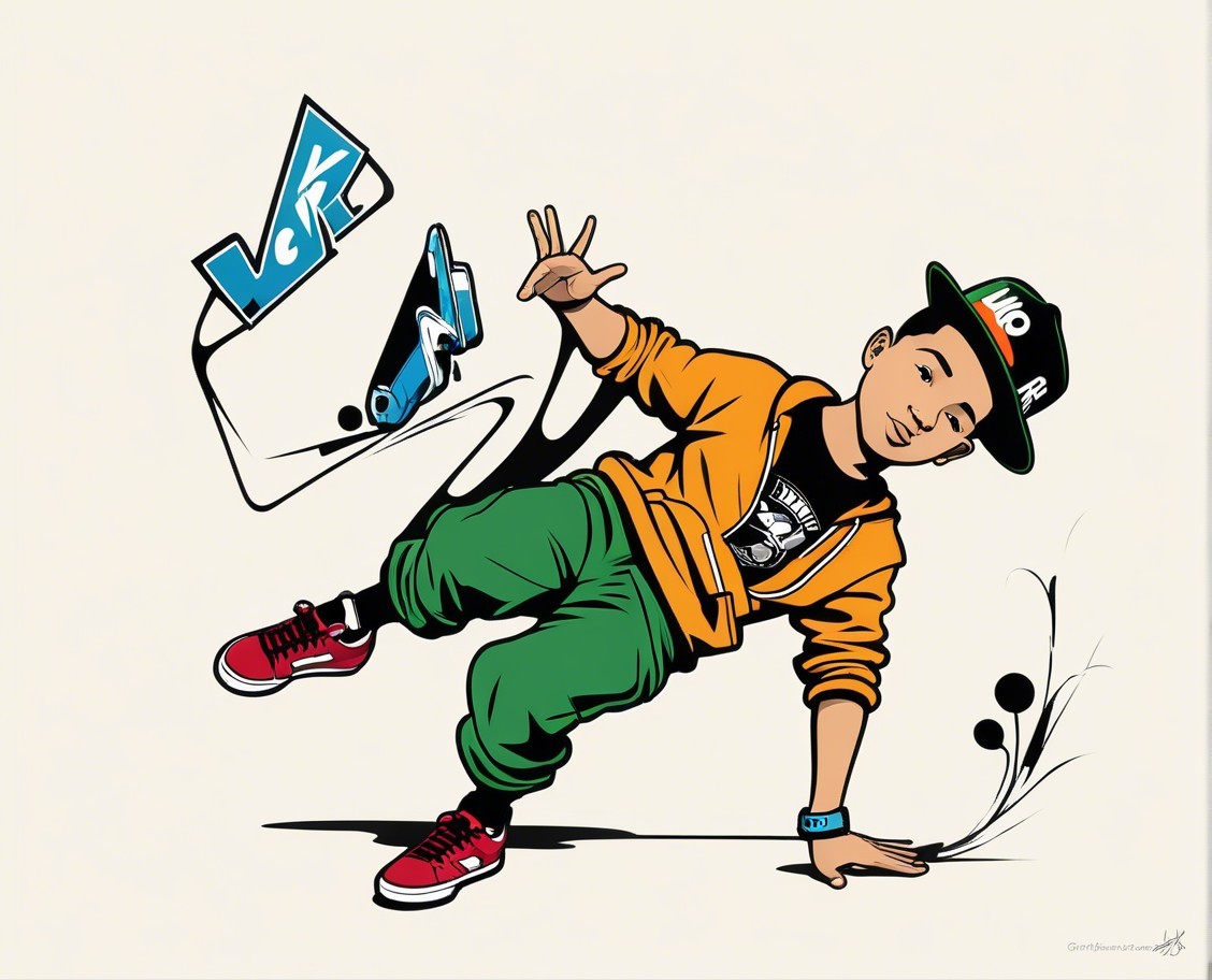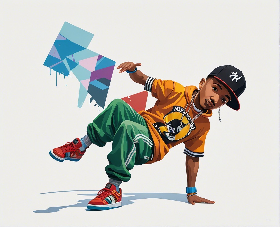 A dancer showcases a dynamic breakdance pose, wearing an orange graphic tee and baggy jeans. Vibrant paint splashes and colorful patterns surround him, adding energy to the scene.
