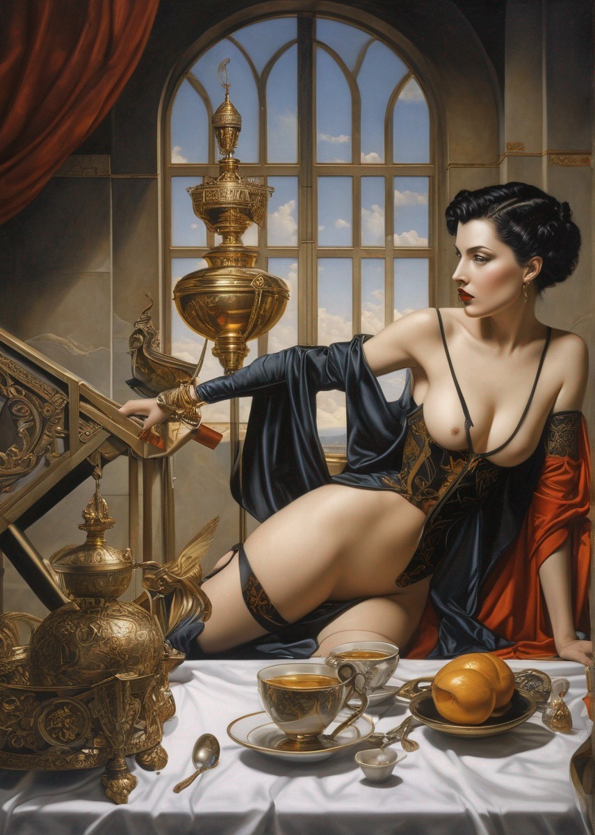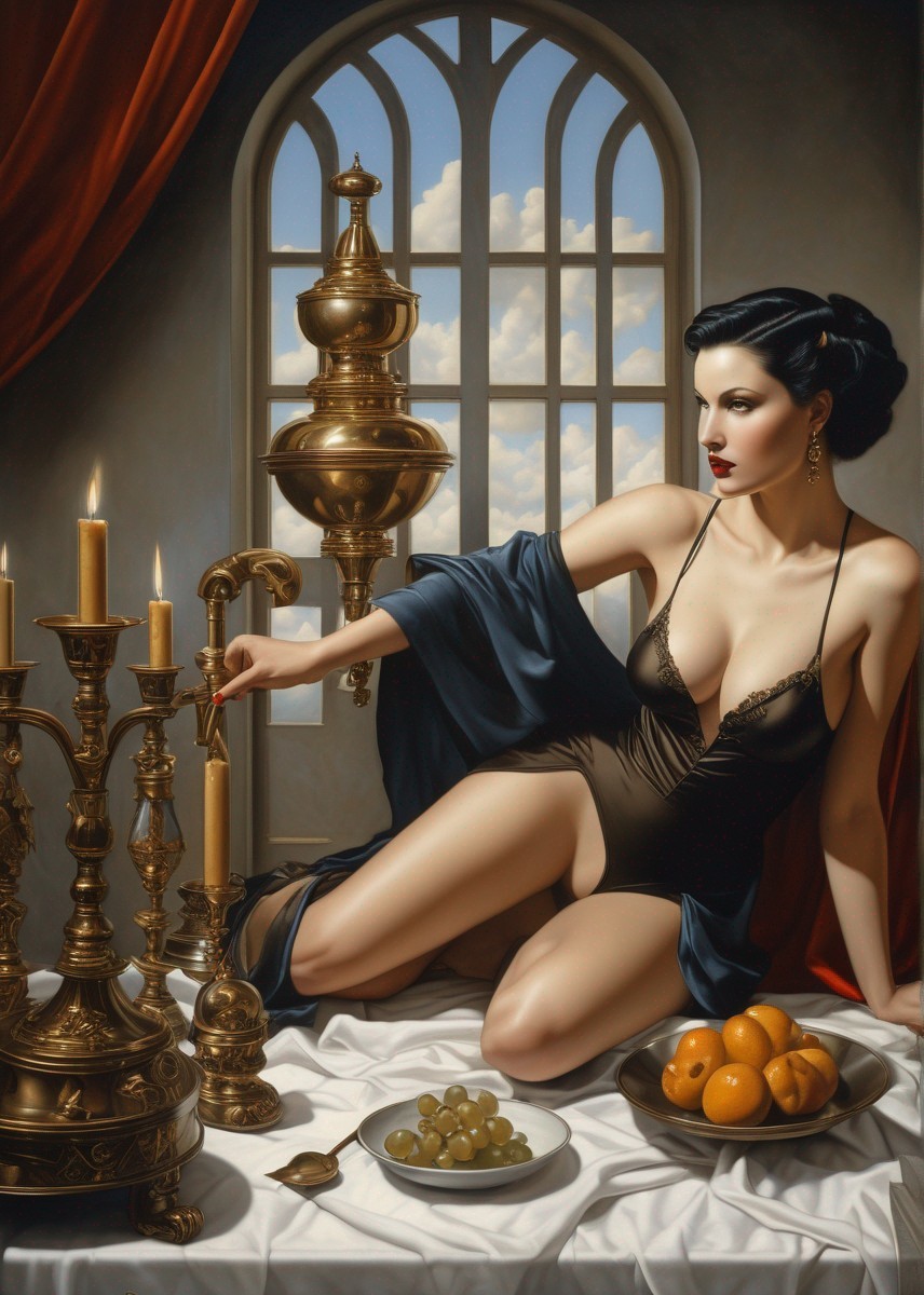 A woman in a classic pose with a large skull, draped in a blue dress amid elegant archways and red curtains.