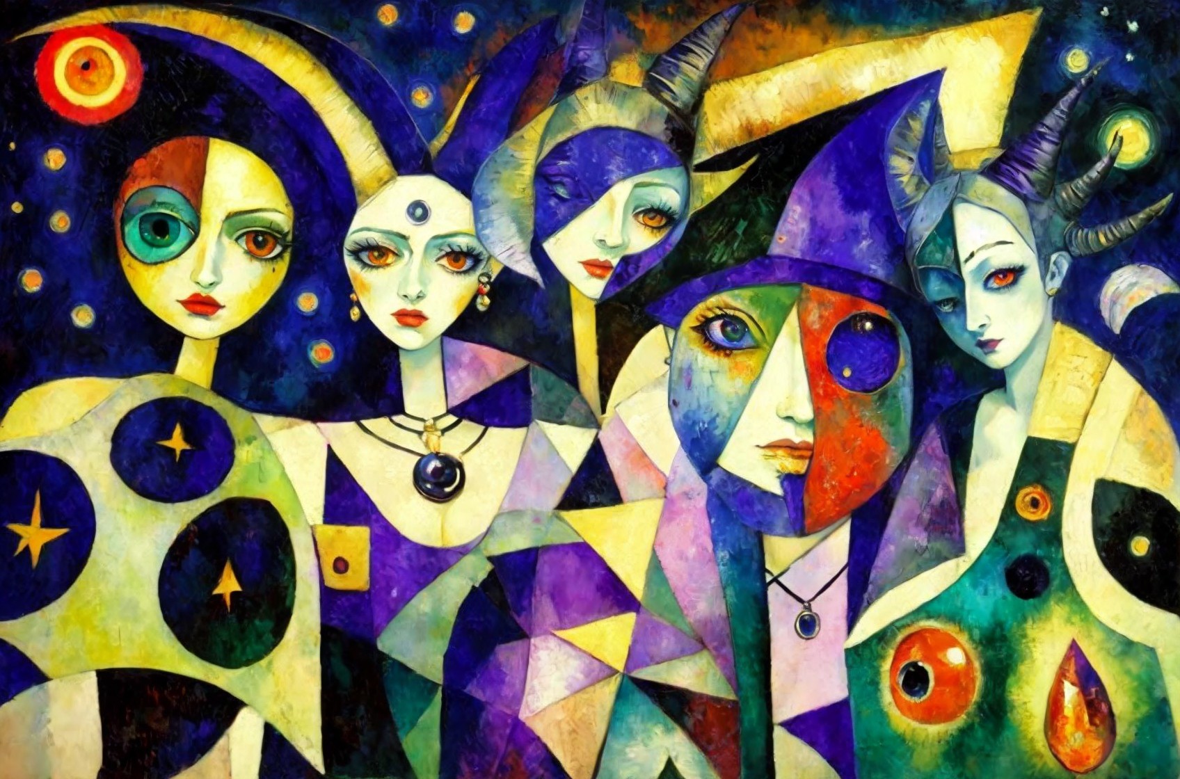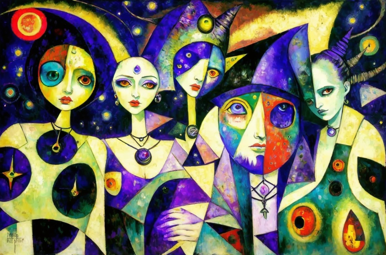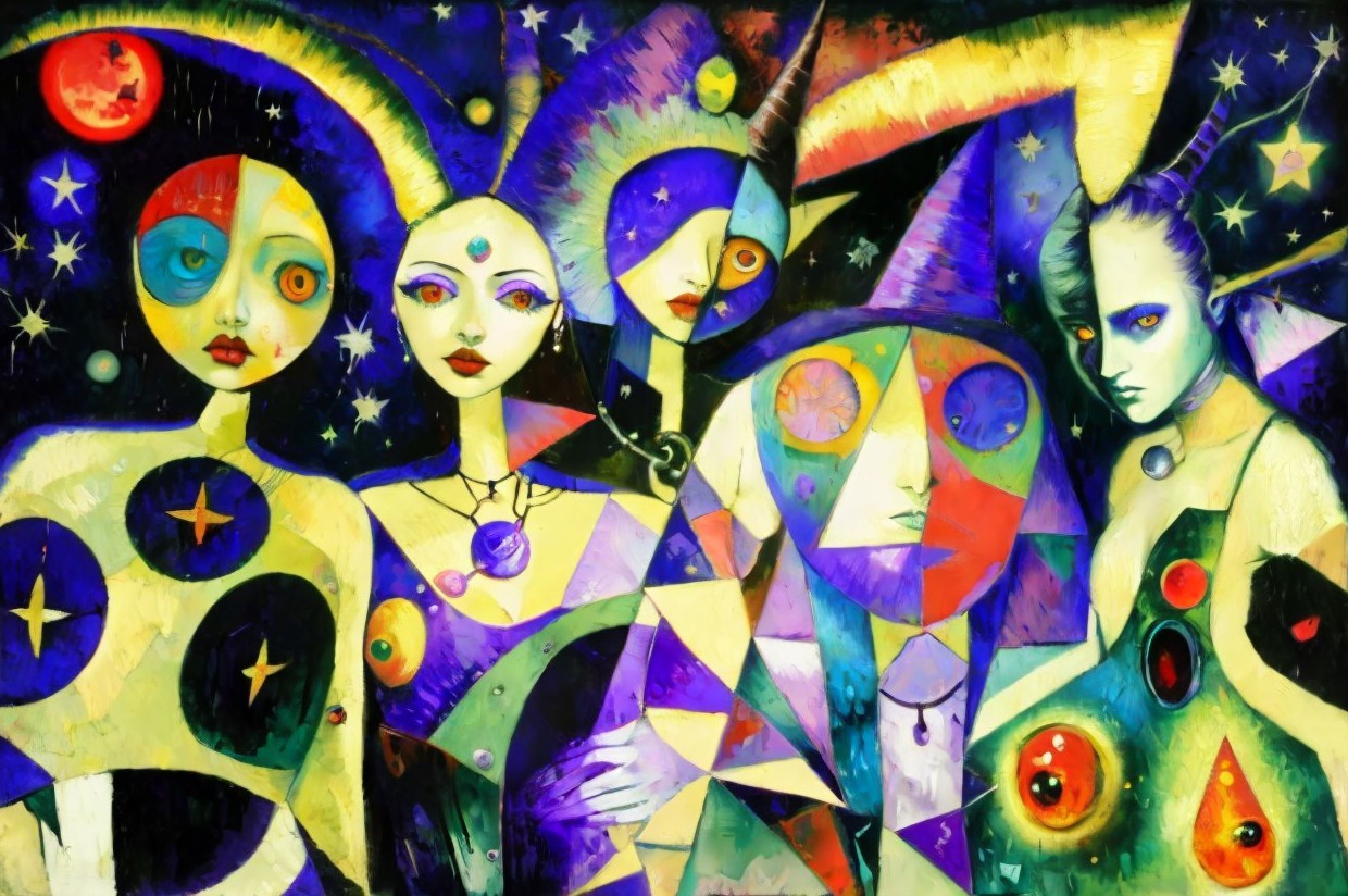 Colorful, surreal painting of stylized women with abstract features and celestial elements amidst a vibrant, starry backdrop.