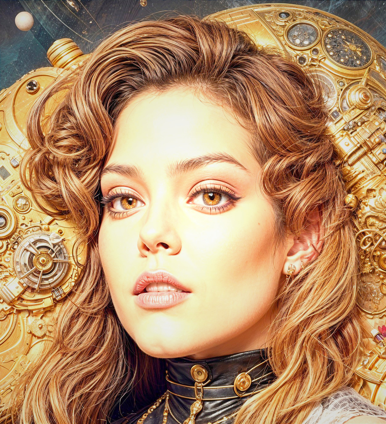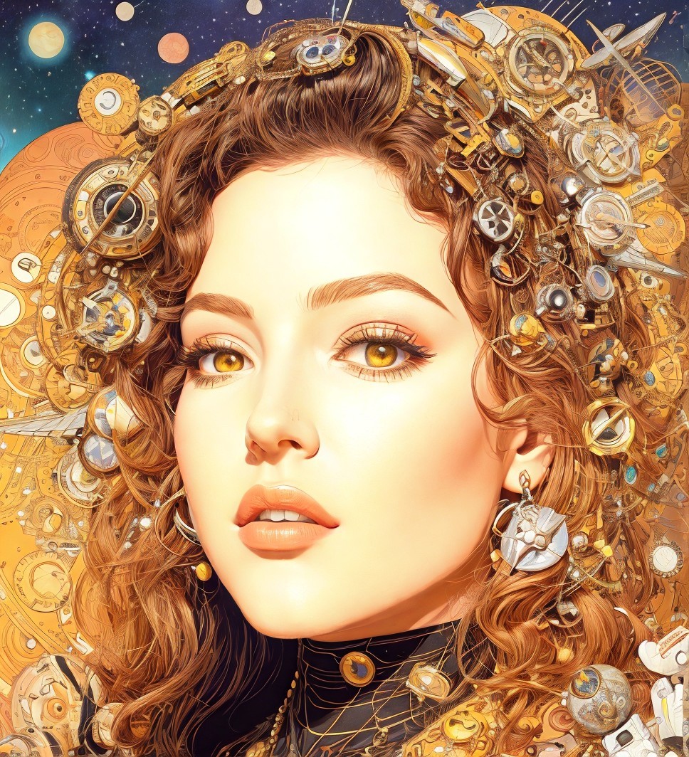 Comical sketch art portrait of handsome teenage temptress surrounded by astronomical details, space age style, science fiction illustration in style of Georgia_O'Keefe and Geof Darrow, tetradic color scheme brown beige black ochre, style of curtis cole and Overton Loyd and Didier Lourenço, line-art background in style of by Friedrich, miro, Chagall, Hopper,Modigliani, Opal, Klee, 3d effects, create intriguing 3D elements, color palette beige , multiple gold shades, grey, brown, silver, gold & hints of copper quilted textile patchwork shades, masterful balance of angles & sinuousness, precision & fluidity, creamy beautiful omposition, headshot, colored pencil sketch hues,comic book art, synthetic, dystopian, maximalism, warm soothing pastel colors, dynamic lighting 1.2, Schreger lines, flamboyant, frankly, fiery, streamline_moderne, high coloring, marvel comic book art, raytraced shadows 1.8, intricate lineage illustration, stylized illustration inspired by Geof Darrow, ambient occlusion 1.5, subsurface scattering, subtle, soft coloring, intricate flowing hair in zentangle method, symmetrical, muscular, , raytraced shadows 1.2, heretic, hues, grain, quilling, quaint, plasticity 1.3, traumacore 1.2, retrofuturistic,, incensed, translucent details, stylized illustration 1.8, dethereal, cottagegore 1.9, dynamic beige lighting 1.7, soft rounded edges, soft tones pallet, abstract, maximalism ,brightness 1.2, 8k, devilish eyes 1.7, american gothic 1.7, scales, shadow mapping 1.3, dynamic pose, gold leaf, abstract, concept art, layered geometrical vector art, vector 9:5, zentangle method, charcoal brushed textures, vibrant colors, fauvistic, eerie, spiritual, golden ratio, soft edges, devilish eyes 1.7, traumacore 1.7, bokeh effects 1.8, beautiful composition 1.9, tints of 1970s advertising art, vector 9:5, fauvistic,