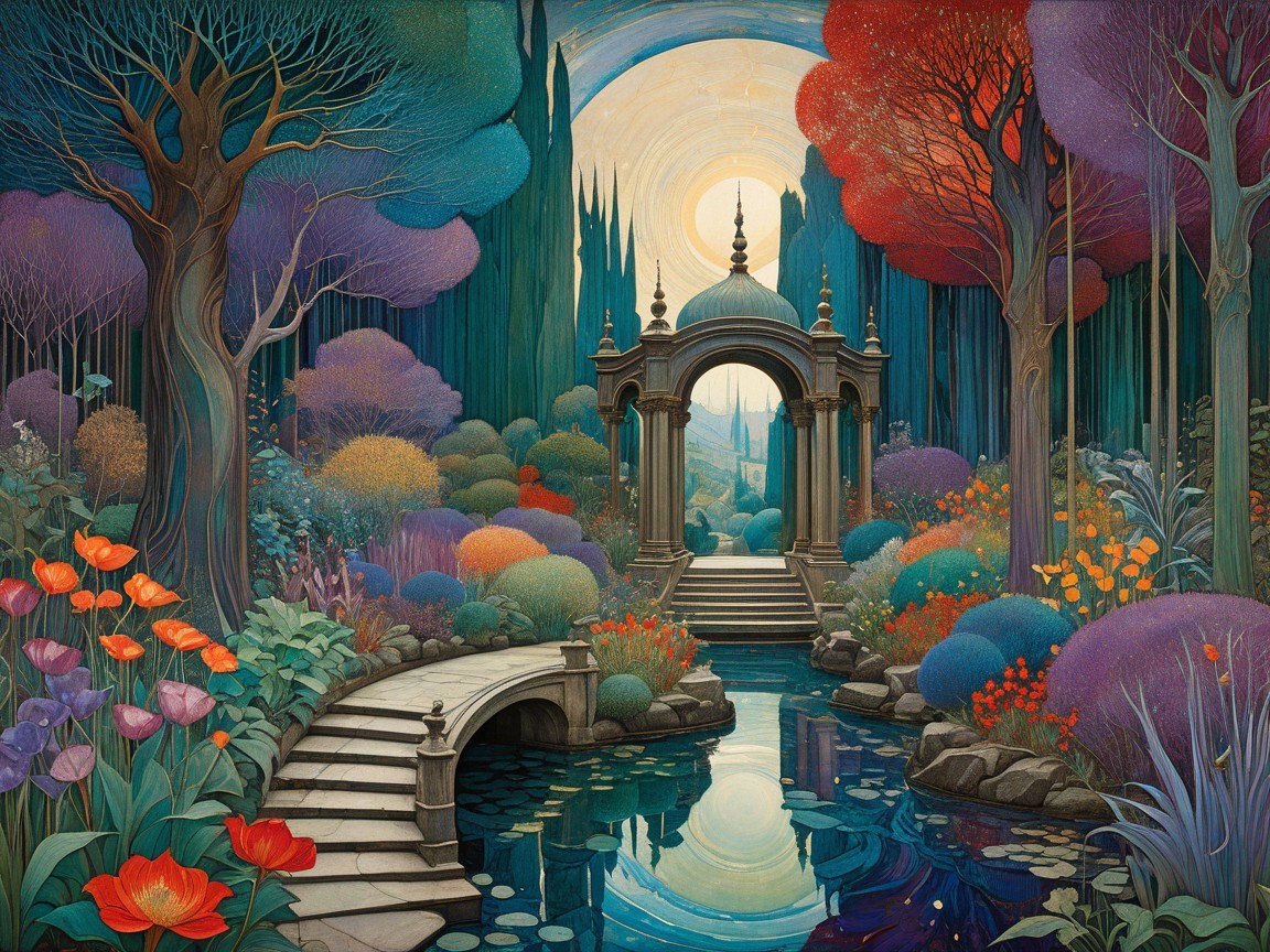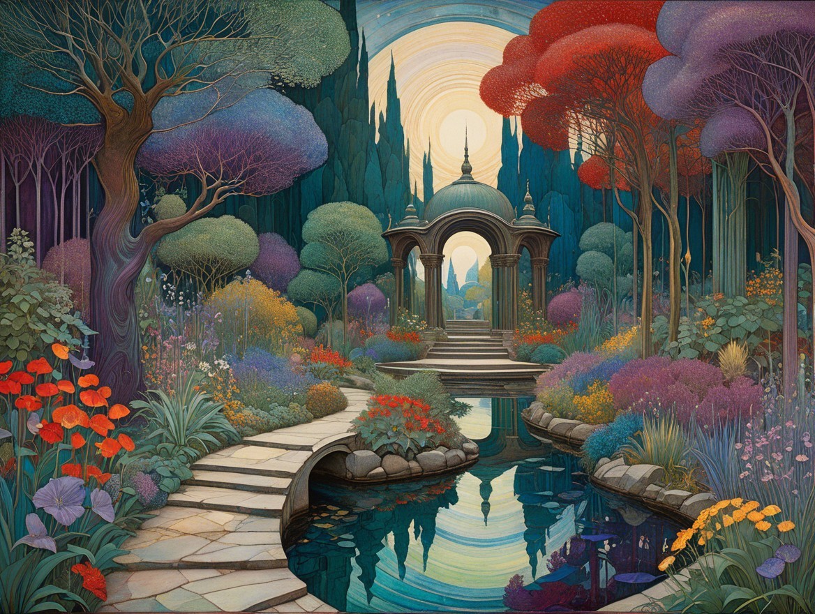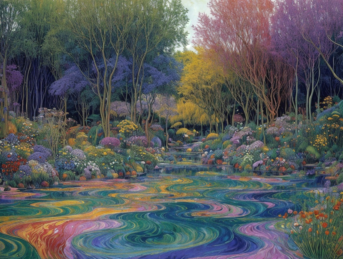 A vibrant, colorful garden scene with lush greenery, blooming flowers in various hues, and a serene winding stream reflecting the vivid landscape under a bright sky.