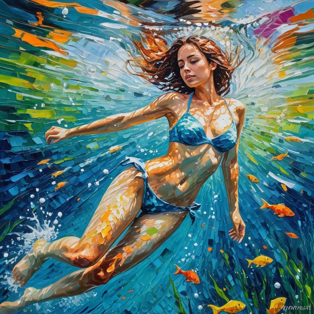A serene underwater scene depicts a woman in a turquoise bikini gracefully swimming amidst colorful fish, surrounded by shimmering light and vibrant aquatic plants.
