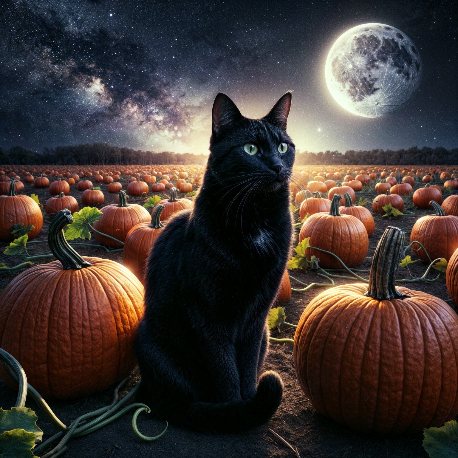 A black cat sits atop a pumpkin in a vast field, surrounded by glowing orange pumpkins under a starry sky with a majestic moon and distant galaxy, creating a magical autumn scene.