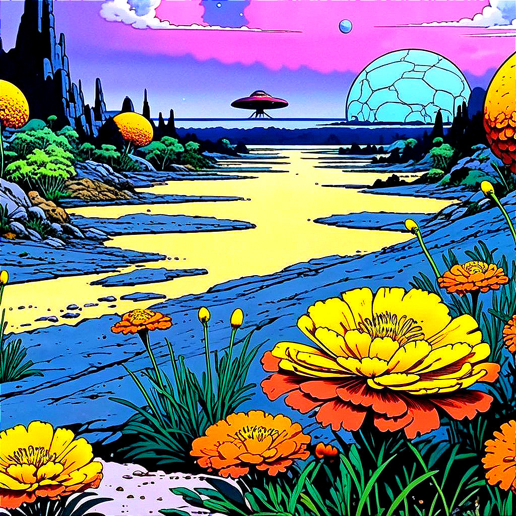 A vibrant alien landscape features colorful flowers and surreal rock formations, with a distant planet and a spaceship hovering in the sky, creating a fantastical, otherworldly scene.