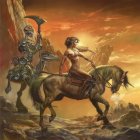 A valiant knight in armor rides alongside a fierce warrior woman, both mounted on majestic horses against a dramatic sunset. The landscape features rugged cliffs and an epic, adventurous atmosphere.
