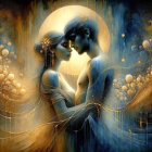 A mesmerizing scene of two ethereal figures intertwined, radiating energy and adorned with intricate patterns. Golden hues dominate the background, merging cosmic elements with a sense of unity.