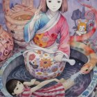 A beautifully crafted illustration of a woman in a colorful traditional outfit, surrounded by floral patterns and a glowing moon, exuding elegance and harmony with nature.