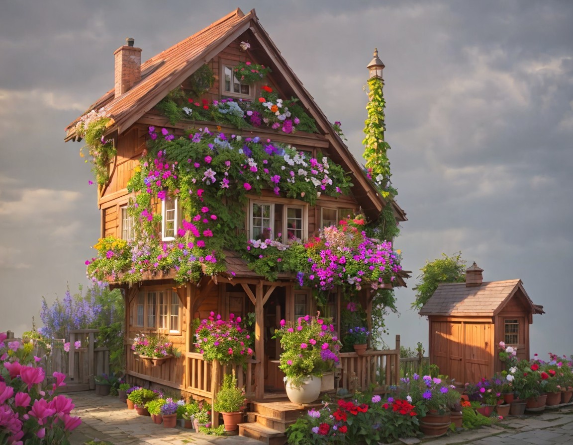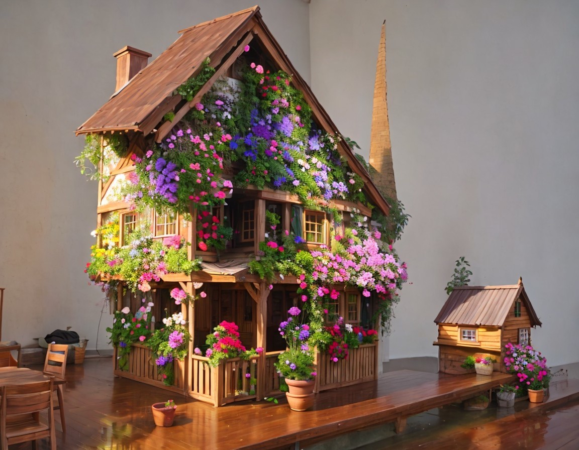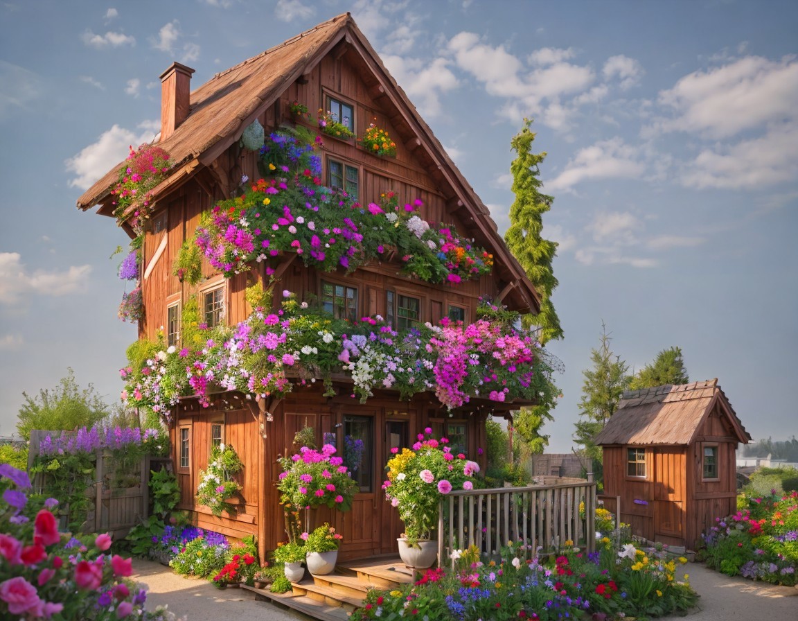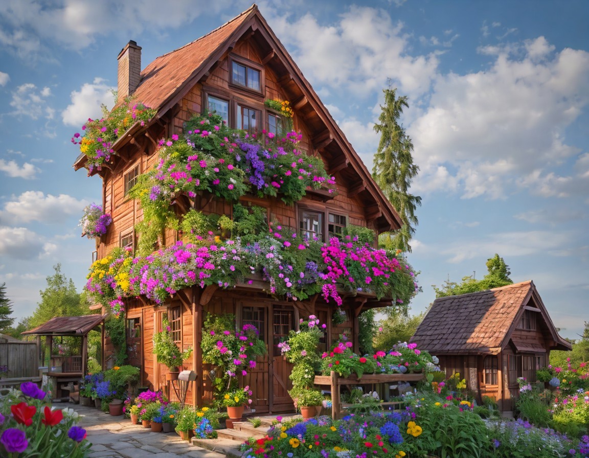 A charming wooden house adorned with vibrant flowers on multiple levels, surrounded by a colorful garden and under a bright blue sky with fluffy clouds. It's a picturesque scene of nature and beauty.