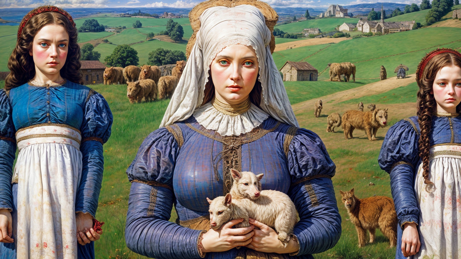 The image features two women in historical attire with intricate hairstyles, set against a pastoral landscape with rolling hills, quaint buildings, and animals, creating a blend of history and fantasy. Note: This comes from an English painter of the 19th century. The original work had a baby and a nurse standing amid some sheep. The work was entitles, "The Pretty Baa Lambs."