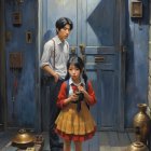 A gracefully dressed couple stands in a traditional setting, illuminated by soft moonlight. The woman in a vibrant kimono exudes elegance, while the man in formal attire complements her beauty.