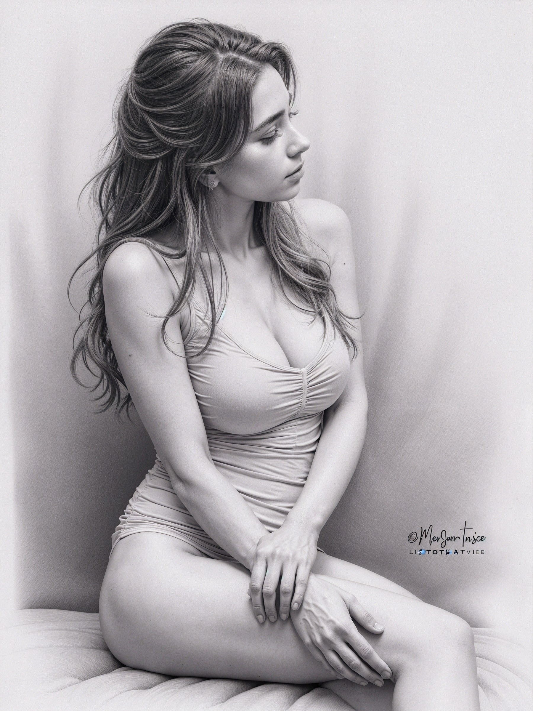 A serene young woman sits gracefully, adorned in a flowing, artistic gown. Her long hair cascades around her, blending with vibrant colors and delicate flowers in the background.