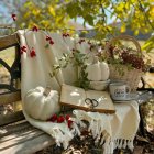 A cozy outdoor scene features a wooden bench adorned with a warm blanket, an open book, white pumpkins, a basket of red berries, and a steaming coffee cup, evoking autumn's charm.