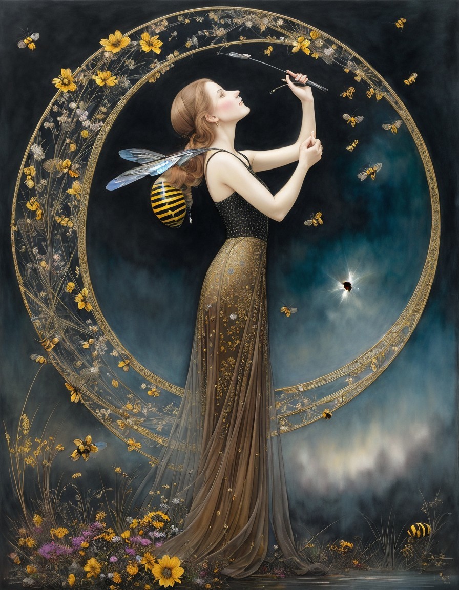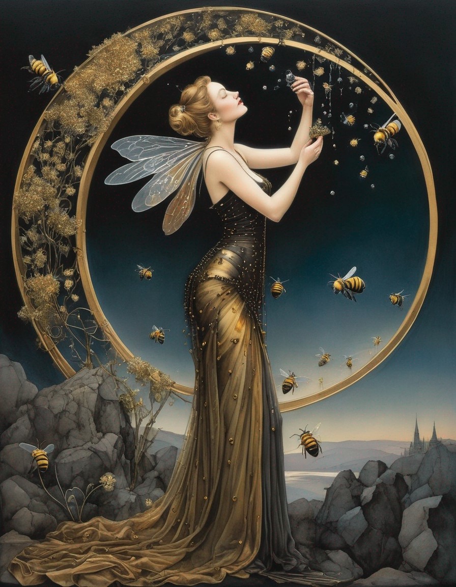 A woman in a golden hat and scarf holds a glass orb with a bee inside, with another bee and bubbles floating around her.