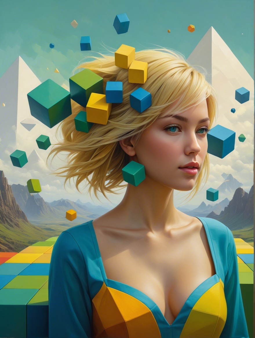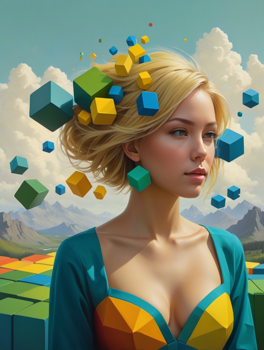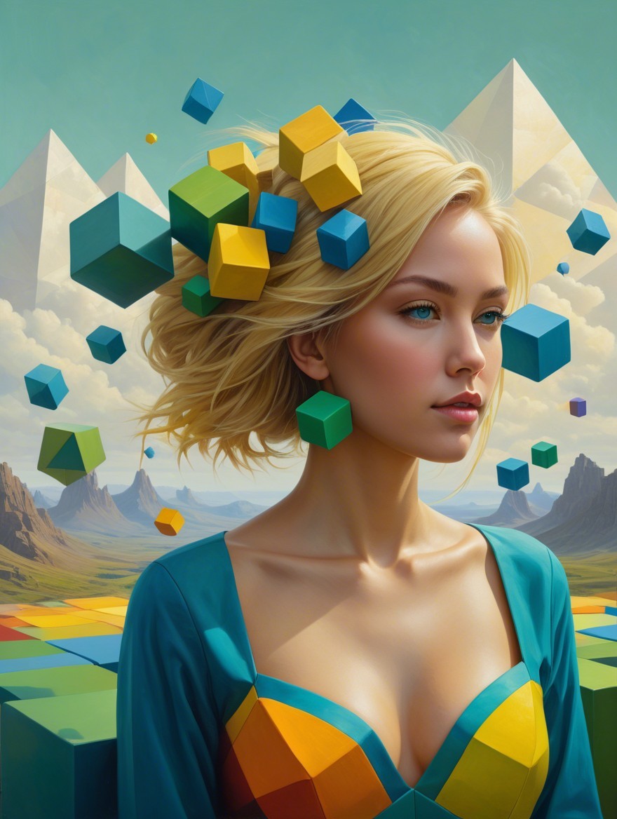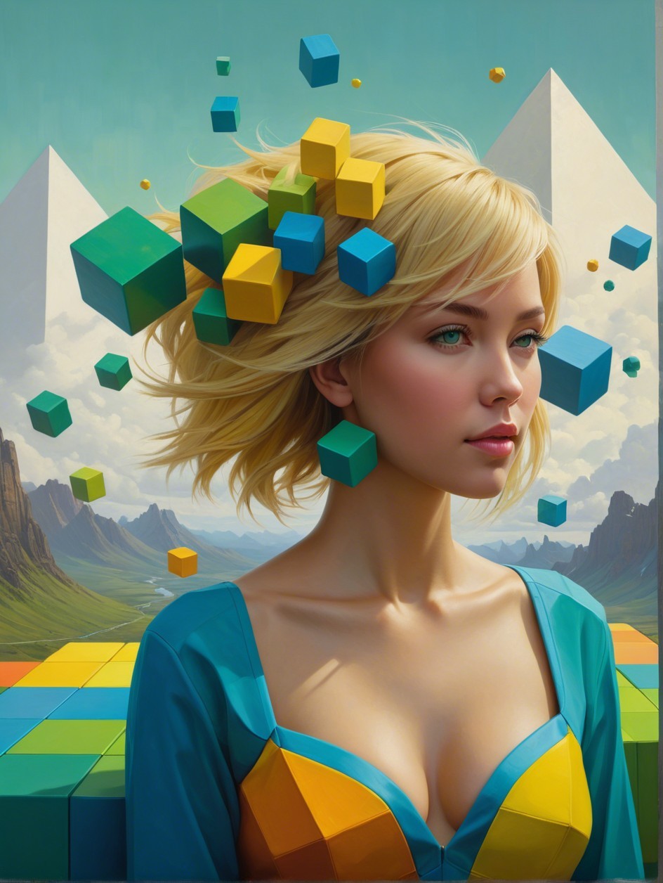 A surreal portrait of a woman with blonde hair, surrounded by floating colorful cubes in an abstract landscape featuring pyramids and geometric shapes, blending beauty with digital elements.