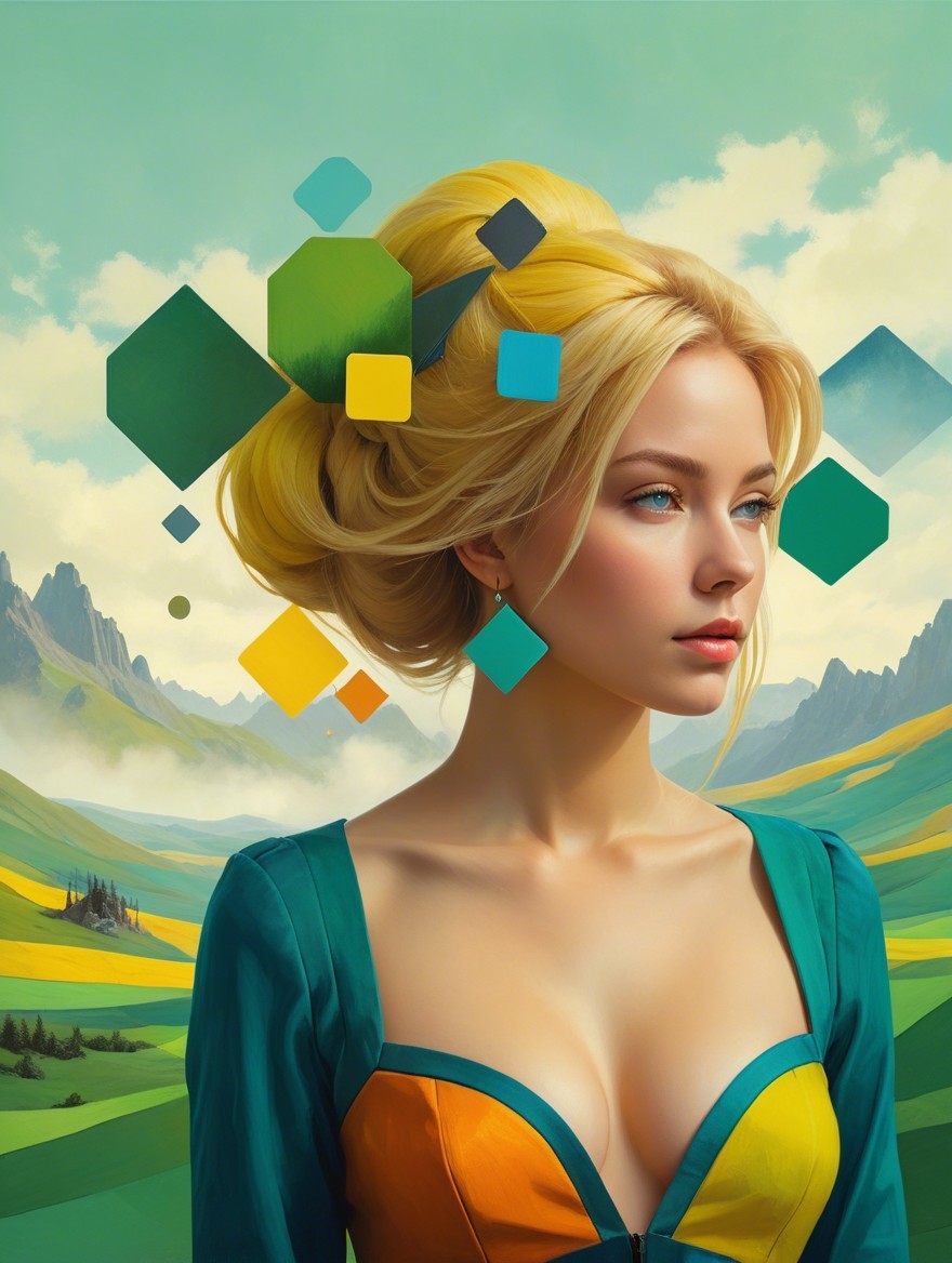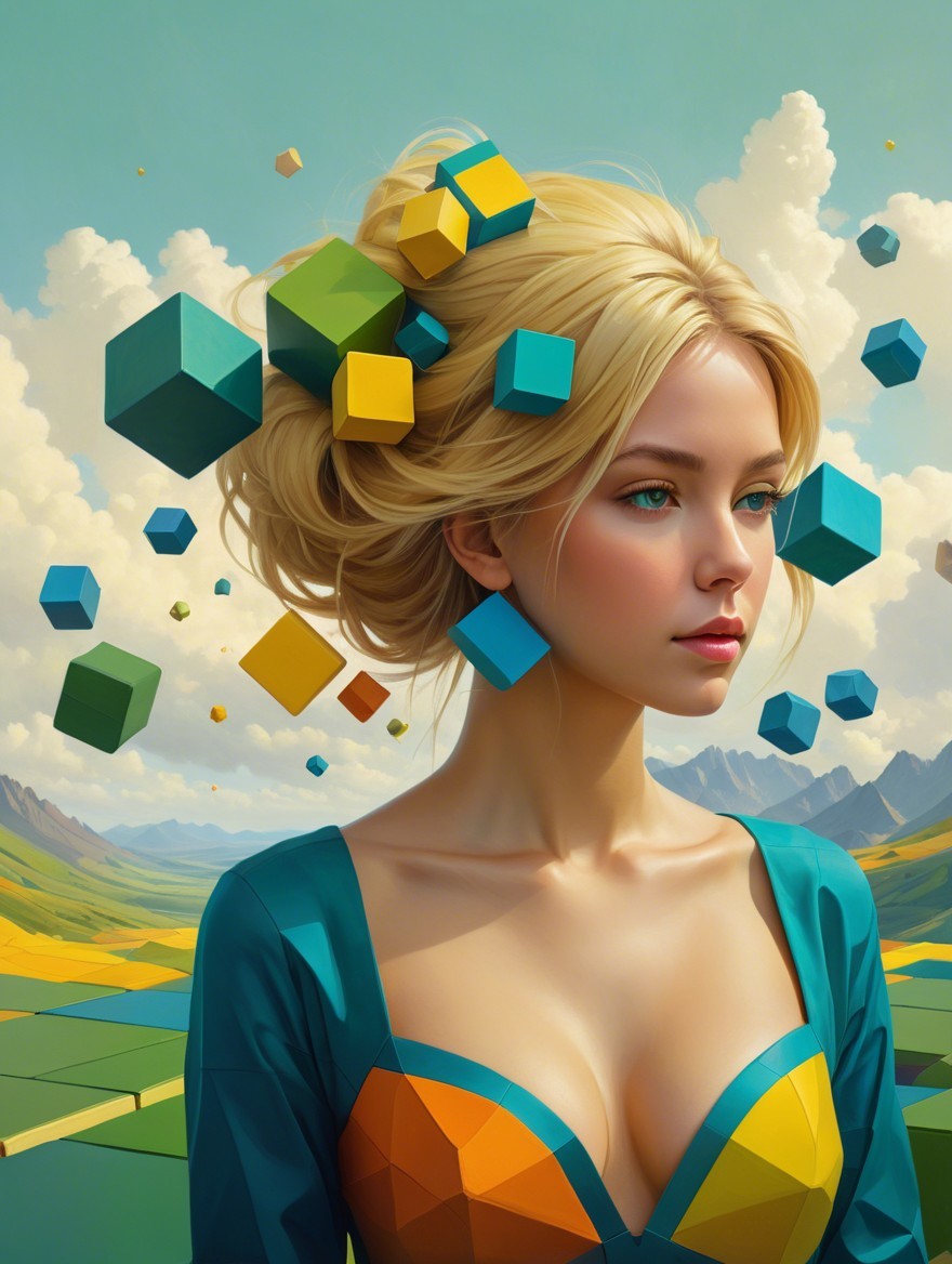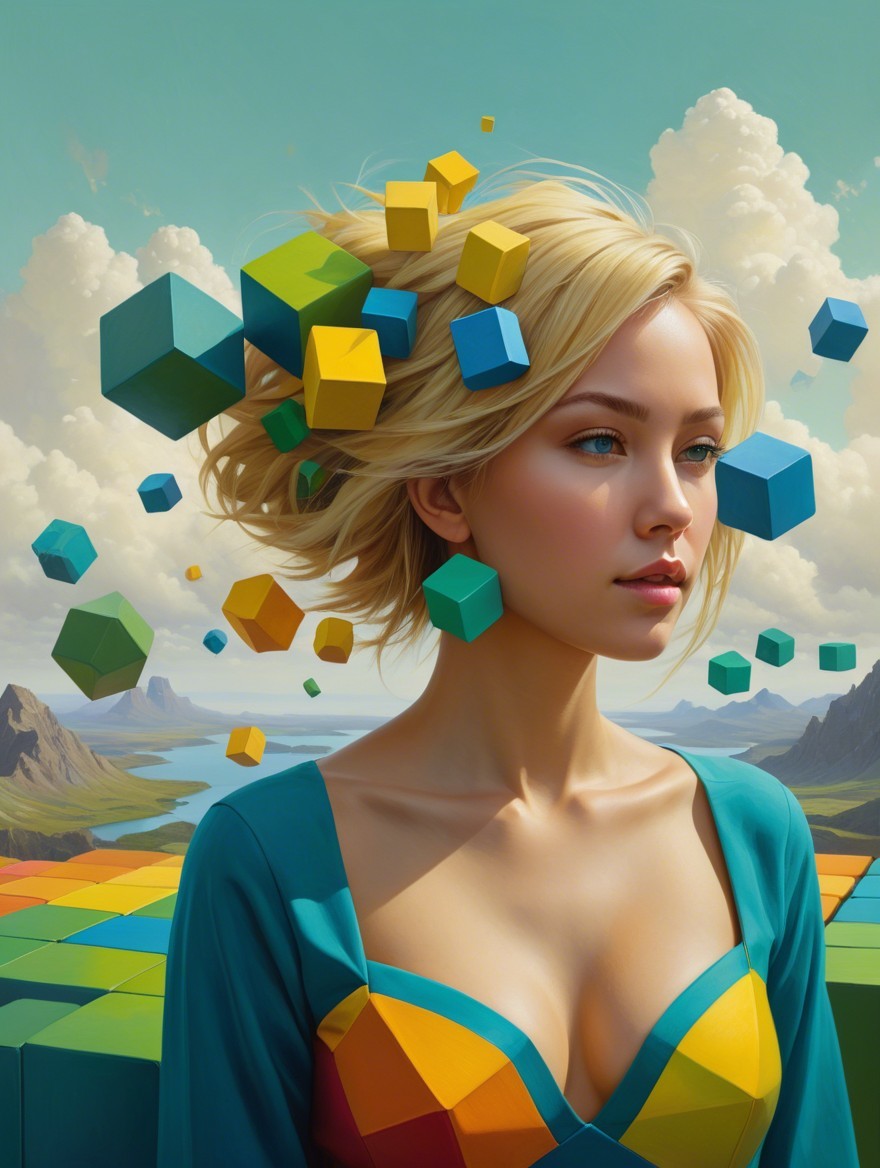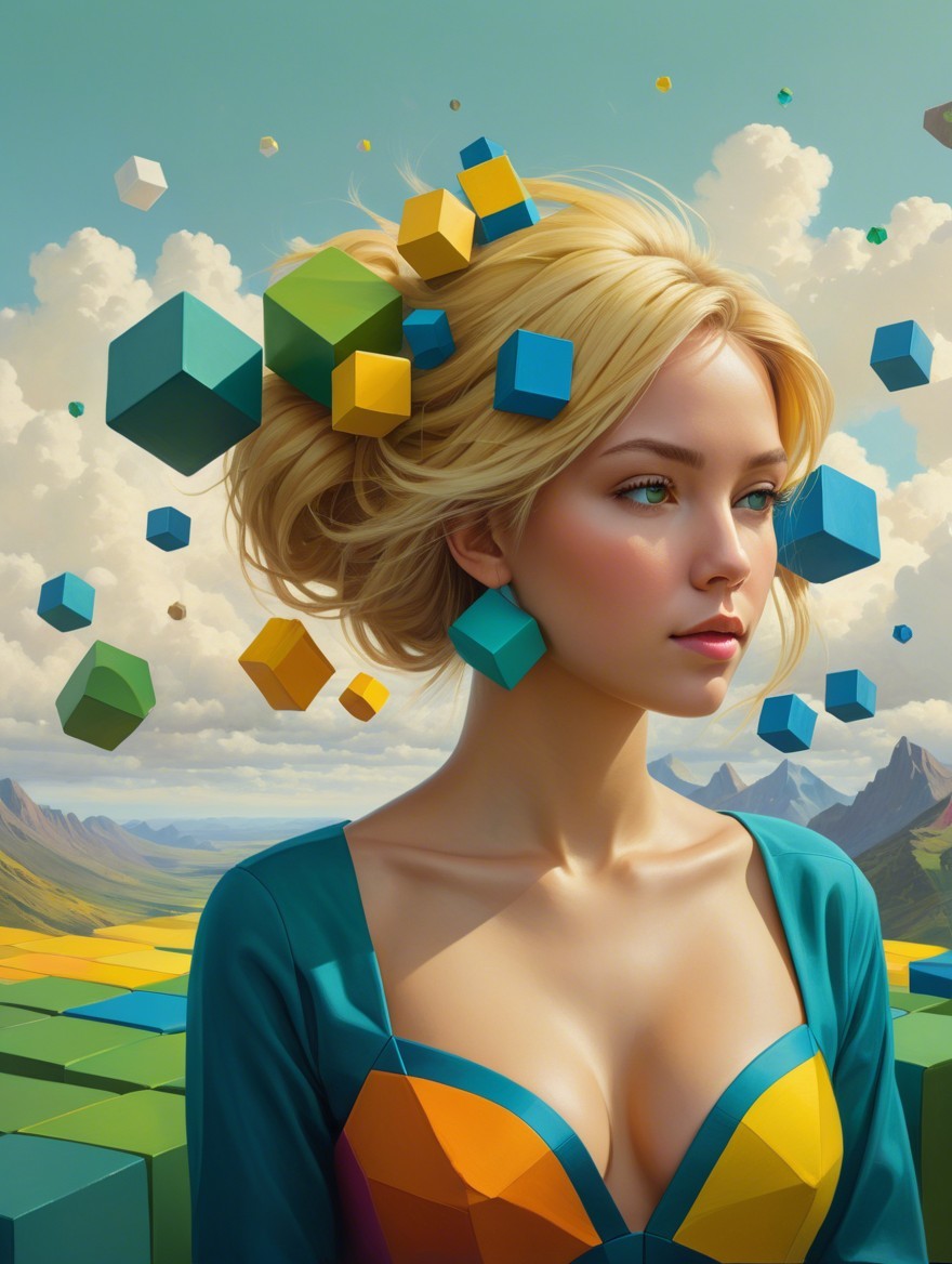 A surreal portrait of a woman with blonde hair, surrounded by floating colorful cubes in an abstract landscape featuring pyramids and geometric shapes, blending beauty with digital elements.