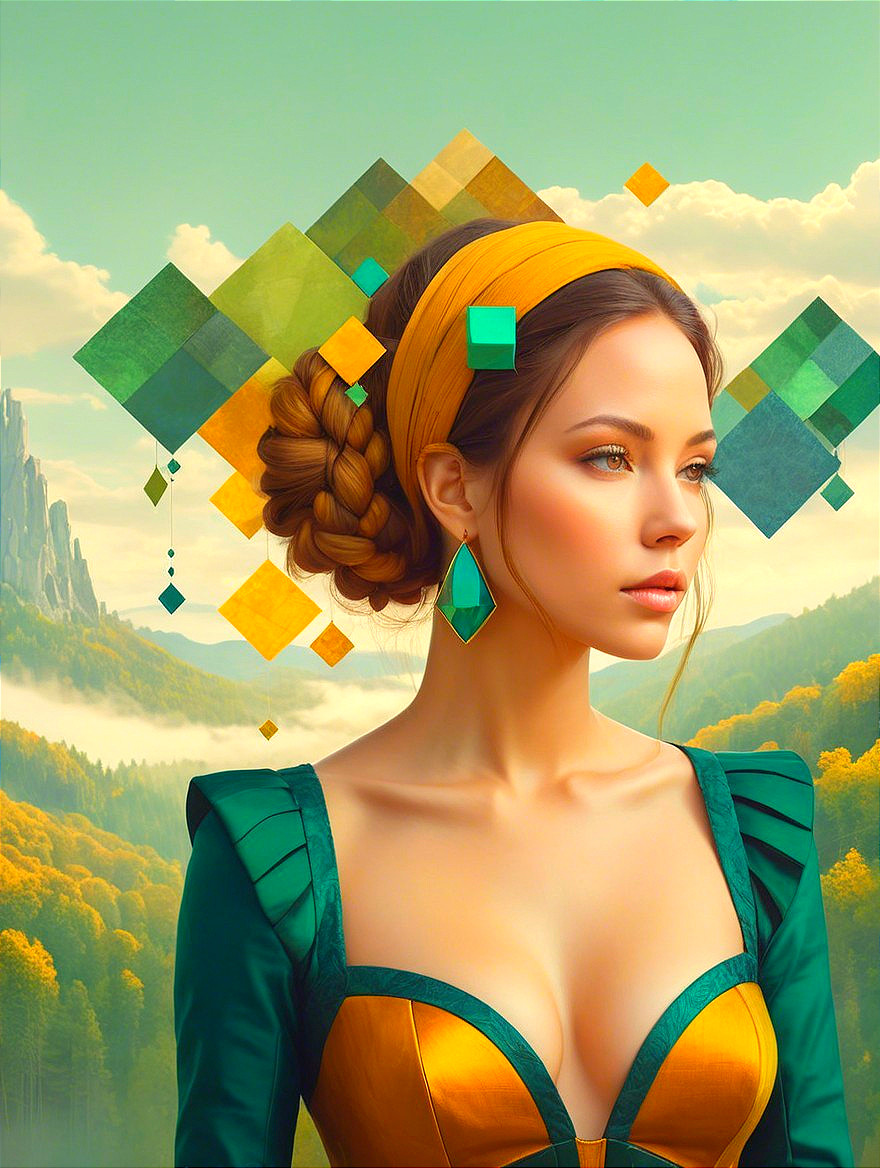 + Prompt:Patchwork by Jessica rossier, triadic color scheme blue green yellow, gothical enchantress, background with natural elements, surreal forestal details in line-art illustration, pastel tones of citrine and ochre, pastel colors of beige and green, zentangle method, dynamic lighting, daguerreotype style, stacked-up perspective, dyed, soft rounded edges, softened lighting, american gothic 1.7, Novelty architecture, overexposed, reminiscent of Frank McCarthy, minimalistic, streamline_moderne merged with comic book art 1.7, dynamic lighting 1.7, ambient occlusion 1.5, parallax occlusion 1.2, squiggly calligraphic precision, serenity, tiny strokes, seductive essence, dethereal atmosphere, traumacore 1.9, unuty render, flat image, blotting textures 1.7, foampunk 1.4, captivating lighting, enhancing, peeling, luminosity 1.3, radiance, rule of thirds, watercolor patchwork, expired film, xeroxed with Hasselblad 60mm f3.5 Distagon CF camera, tesselated, stippled, sculpted, baroque, divisionism, plasticity 1.3, auracore, only curves, style of gil bruvel, precise Gelsculpt 64K, parallax occlusion 1.2,