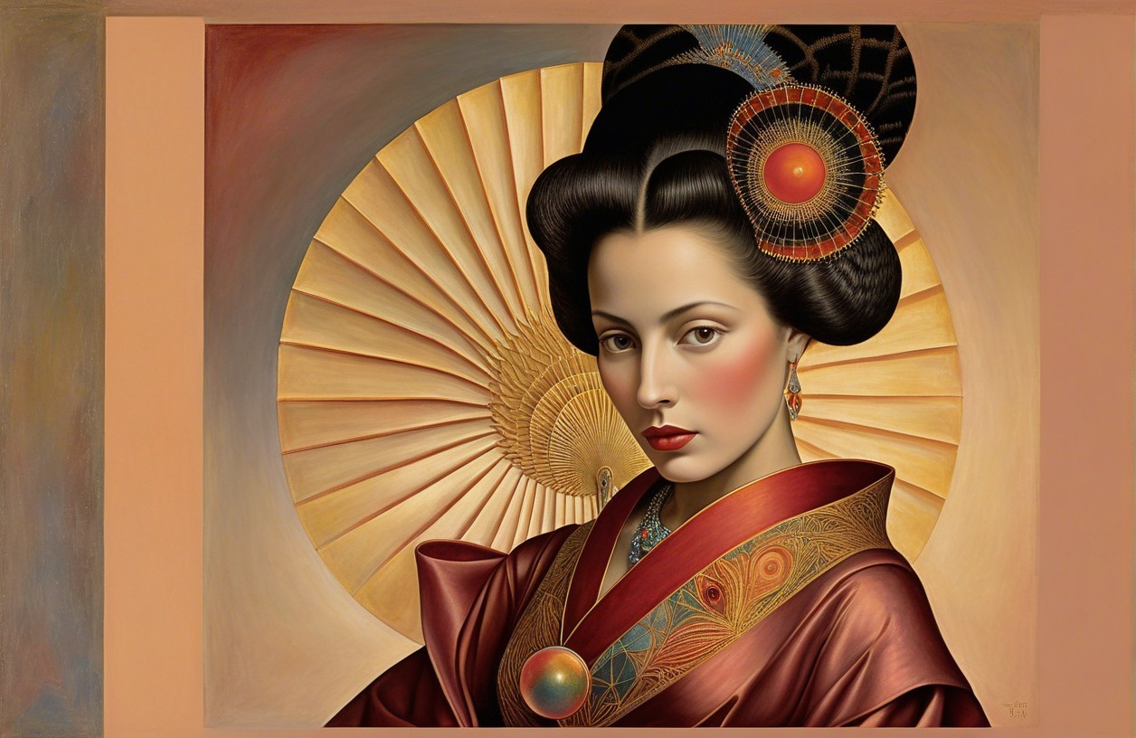 A single image, psychedelic siren, style of Alex Grey, style of Remedios Varo, style of Paul Klee, style of Leonora Carrington, eye contact, soft, beautiful delicate interplay of light and shadows on every surface, exotic, vivid, radiant, kaleidoscopic, highly colorful, most complex and highly intricate, dominant golden and rouge colors, highly intricate and utterly complex designs and patterns, exciting.