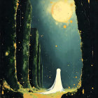 A serene night scene with two figures holding hands under a full moon. They stand on a path surrounded by vivid trees and glowing flowers, creating a magical, enchanting atmosphere.