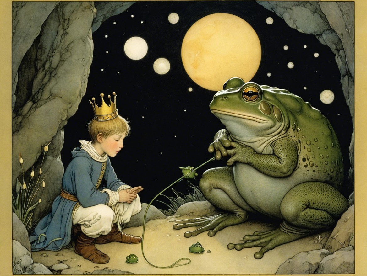 A young prince and a boy sit before a large, anthropomorphic frog under a moonlit sky. The scene is whimsical, blending elements of fairy tale and fantasy.