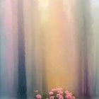 A tranquil forest shrouded in soft fog, with tall trees rising majestically. A path of vibrant pink flowers leads into the ethereal scene, where light filters softly through the mist.