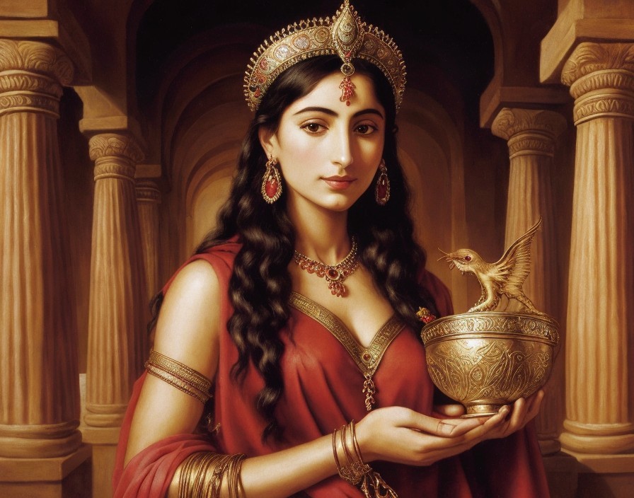 A regal woman in a crown holds a chalice with a dragon; ornate columns in the background evoke a palatial atmosphere.
