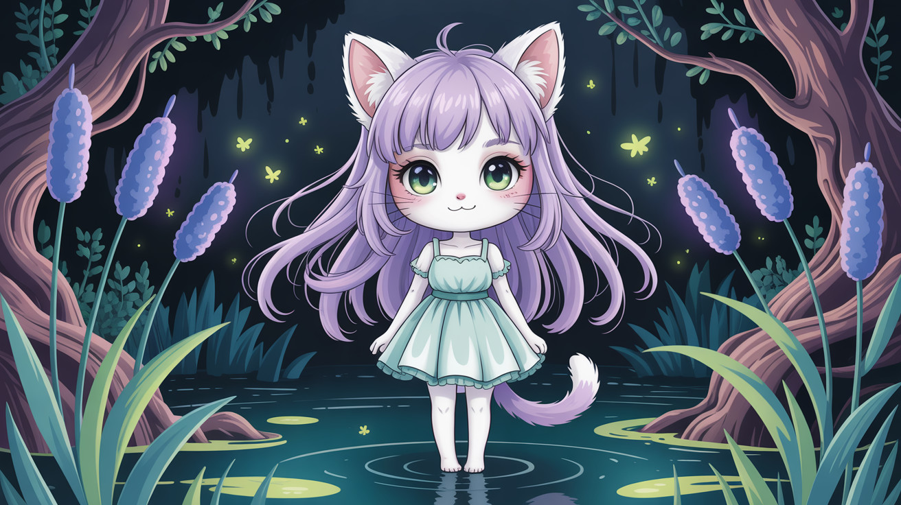 A whimsical scene unfolds in a misty bog where a charming magical catgirl playfully interacts with her enchanting surroundings, her vibrant ears and tail adding a touch of fantasy to the tranquil setting.