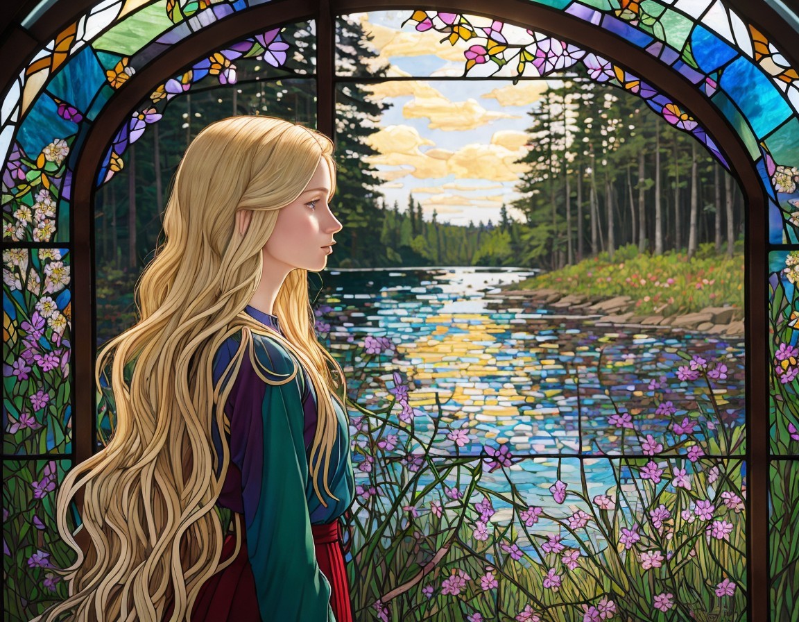 An illustration of a woman with long blond hair gazing out of a stained-glass window overlooking a serene forest and river scene.