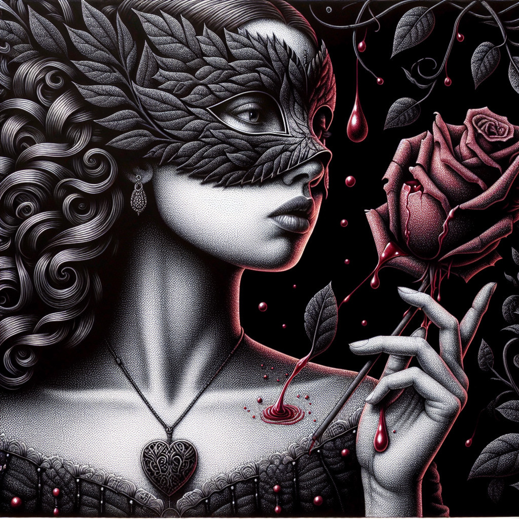 A woman with an intricate black lace mask gazes alluringly, holding a deep red rose. Drops of blood and dark leaves accentuate the elegant, mysterious atmosphere of the artwork.
