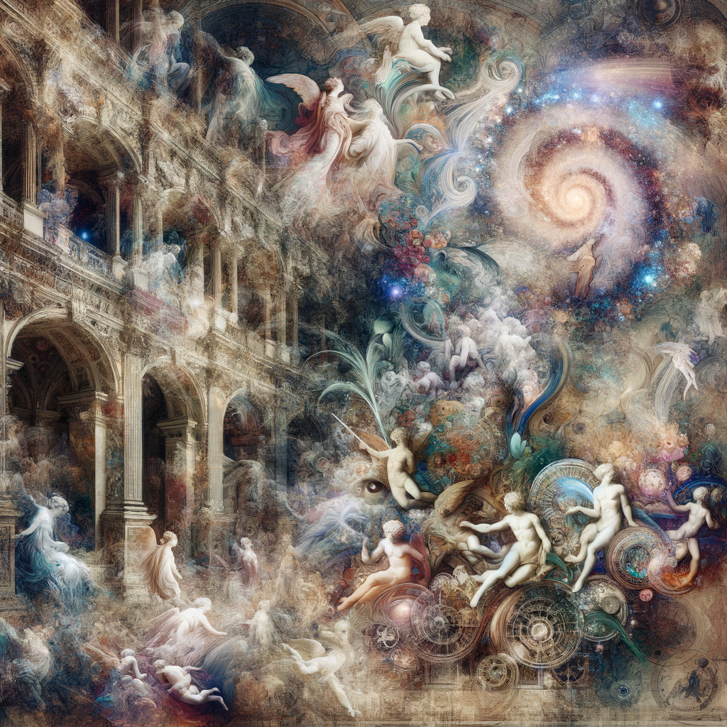 A vibrant, fantastical scene featuring various colorful birds in flight amidst intricately detailed trees and flowers, set against a rich, dark background filled with subtle sparkle.