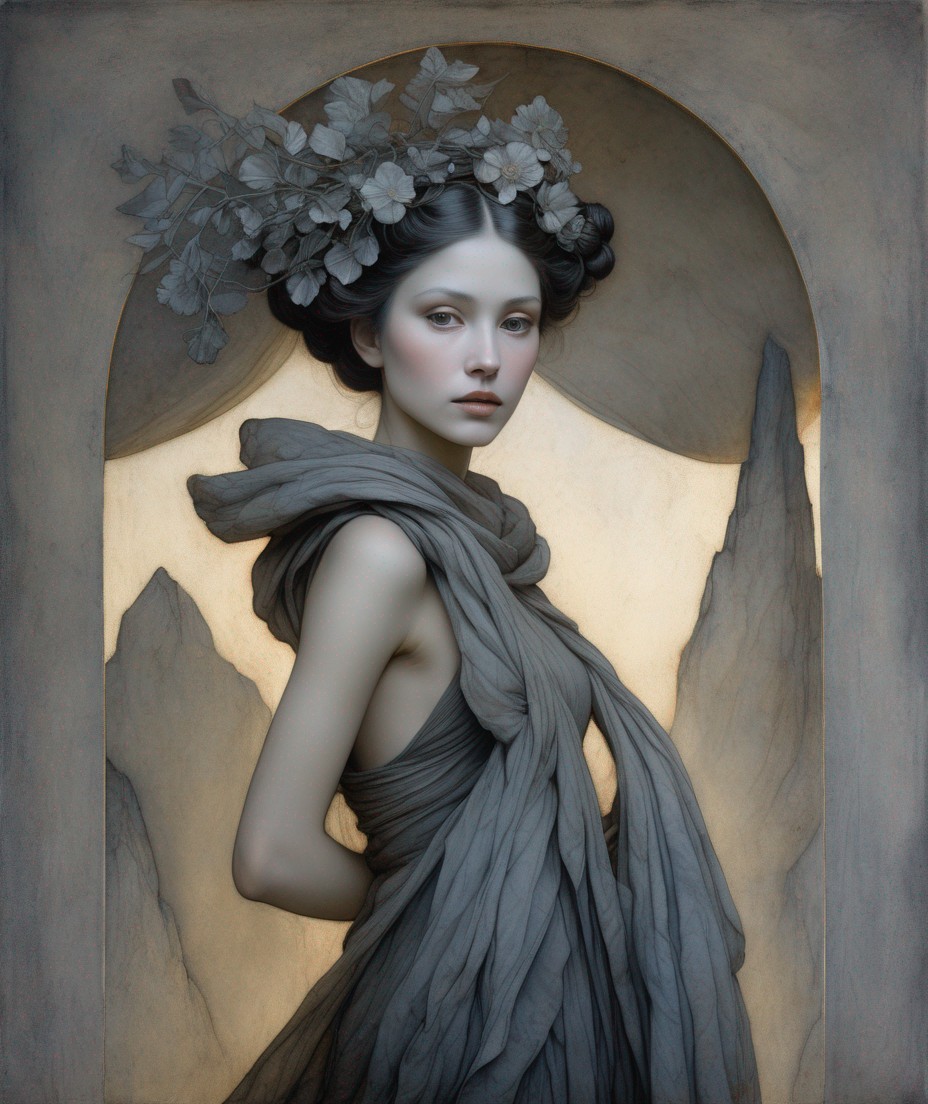 A woman with an ethereal look, dramatic makeup, and an elegant flower headpiece draped in flowing, gauzy fabric against a muted background.