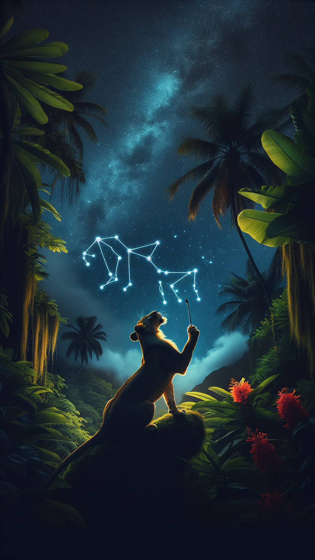 A lioness lounges gracefully amidst lush foliage, illuminated by a starlit sky. Vibrant flowers bloom around her, creating a serene and enchanting atmosphere in a natural landscape.