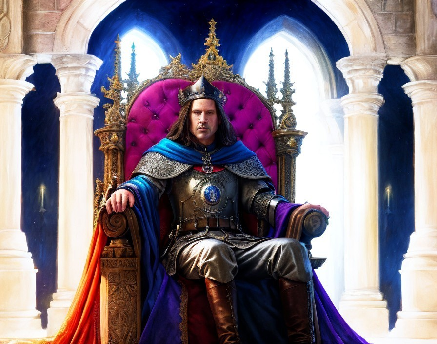 A regal man in medieval armor sits on a throne, wearing a crown, with a commanding presence and a contemplative expression.