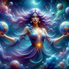 A woman with flowing purple hair is dressed in a shimmering, cosmic-themed gown. She gracefully poses against a backdrop of swirling galaxies and bright stars, embodying a celestial vibe.