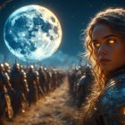 In a mystical landscape, a warrior princess in ornate armor gazes into the distance, illuminated by a giant moon. Behind her, a legion of armored soldiers stands ready for battle.