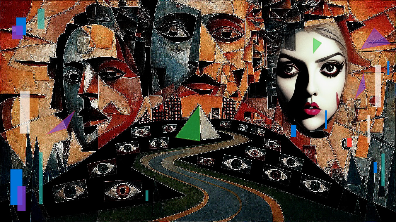 The artwork features abstract faces with striking eyes, set against a vibrant backdrop. A winding road leads through geometric shapes, symbolizing a journey or exploration of identity.