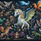 A whimsical collage of fantasy creatures, featuring a majestic unicorn with wings, various dragons, playful cats, and mythical beings, all set against a dark starry background.