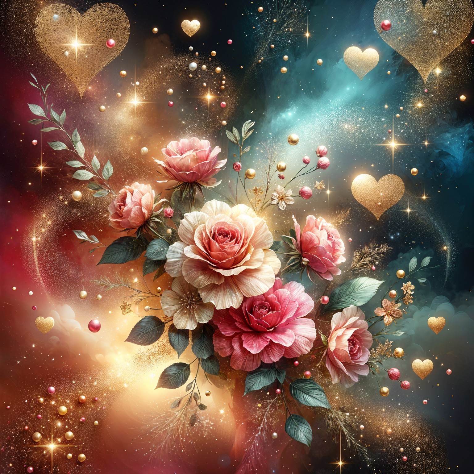 A vibrant floral arrangement features lush roses in shades of pink and cream, surrounded by sparkling stars and golden hearts against a cosmic backdrop of deep blue and teal.